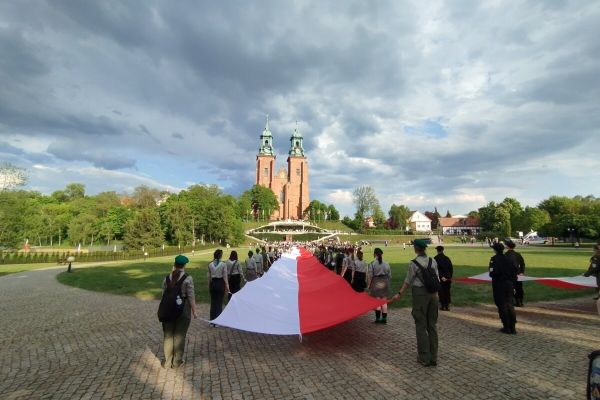 W wyjątkowy sposób w Gnieźnie uczczono Dzień Flagi Rzeczypospolitej Polskiej. Ulicami miasta przeszedł uroczysty pochód, którego głównym symbolem była imponująca, stumetrowa biało – czerwona wstęga narodowa. Wydarzenie zgromadziło wielu uczestników, którzy z dumą nieśli narodowe barwy, manifestując tym samym jedność i patriotyzm.