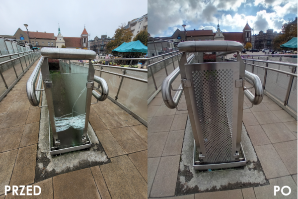 Po rewitalizacji targowiska w 2014 roku było tam jakby luksusowo, jednak czas i sami mieszkańcy zweryfikowali pierwotne zamysły projektantów i szklane elementy poręczy musiały ustąpić miejsca blasze.