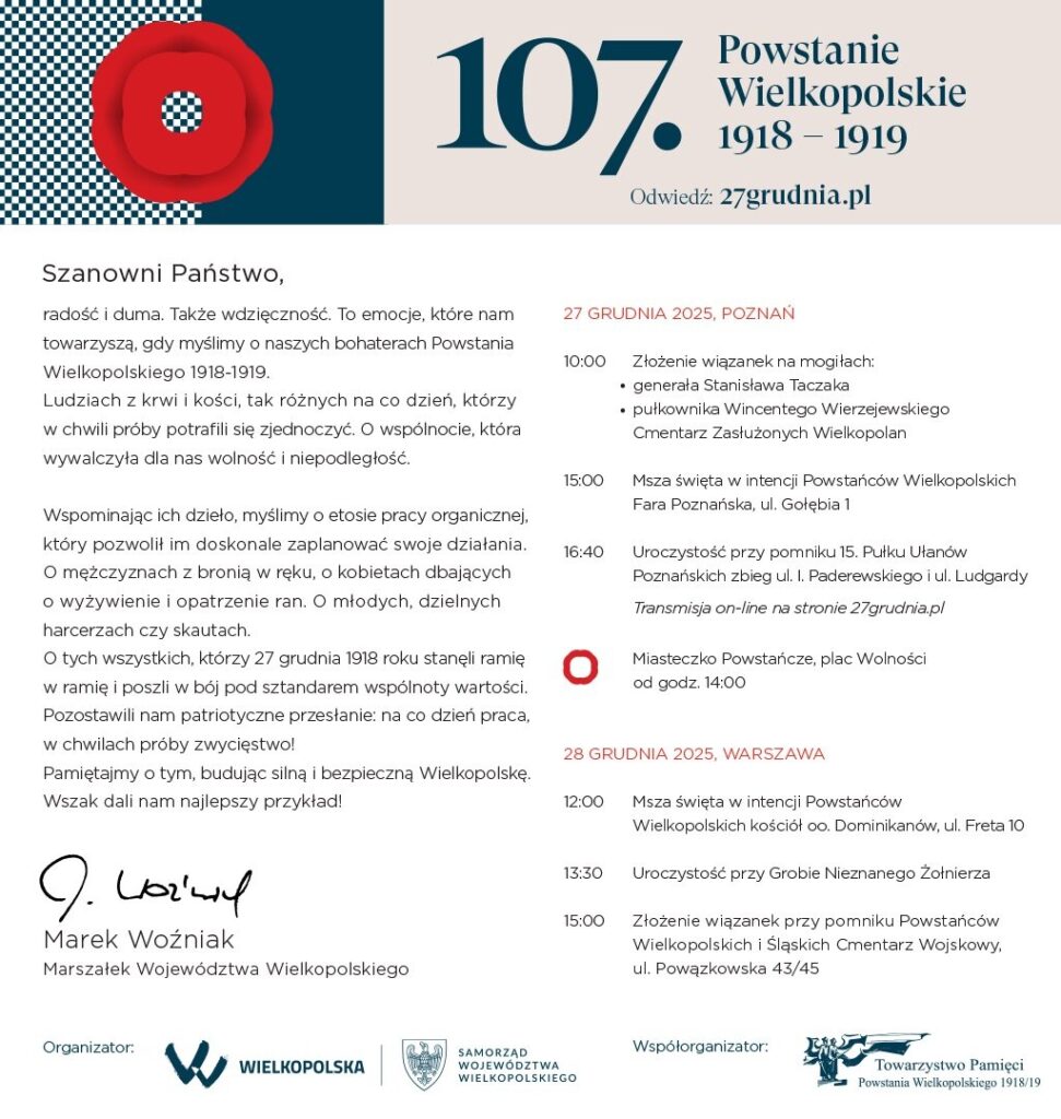 Marek Woźniak, Marszałek Województwa Wielkopolskiego zaprasza Wielkopolan do wzięcia udziały w uroczystościach związanych ze 107. rocznicą wybuchu zwycięskiego Powstania Wielkopolskiego 1918 – 1919.