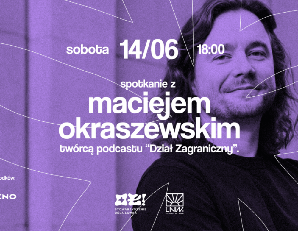 Latarnia na Wenei – czyli plenerowy dom kultury przy jeziorze Jelonek nie zwalnia tempa już na początku sezonu. Dzień po otwarciu Stowarzyszenie Ośla Ławka, czyli opiekunowie tego miejsca, zapraszają na spotkanie z Maciejem Okraszewskim, autorem podcastu „Dział Zagraniczny”. Spotkanie odbędzie się 14 czerwca o godz. 18.00 i poprowadzi je Piotr Buratyński. Wstęp wolny!