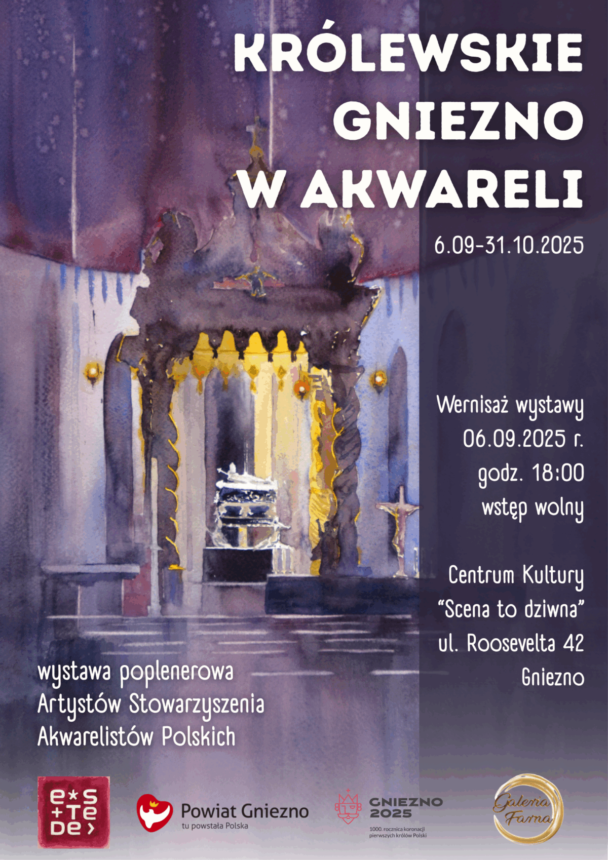 Centrum Kultury „Scena to dziwna” oraz Galeria Farna zapraszają na wernisaż wystawy poplenerowej „Królewskie Gniezno w akwareli”; 6 września (sobota), godzina 18, galeria „eSTeDe”. Wstęp wolny!