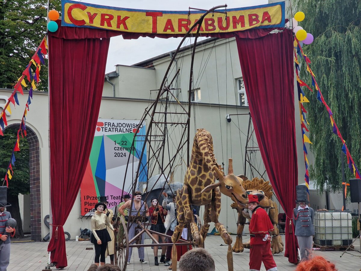 Frajdowisko Teatralne to zupełnie nowa inicjatywa gnieźnieńskiego Teatru Fredry skierowana do najmłodszych widzów. Jej najważniejszym założeniem jest zajęcie uwagi dzieci i młodzieży wydarzeniami w plenerze, z wykorzystaniem ruchu i przestrzeni. Klasyczna forma teatru dziecięcego w usystematyzowanej sali, podzielonej na scenę i widownię, ma swoje ograniczenia, które znikają w przestrzeni zewnętrznej. To daje dużo większe możliwości oddziaływania na wyobraźnię, słuch i wzrok młodego człowieka. Plener od zawsze był jedną z najważniejszych twarzy teatru i słusznie jest kierowany także do odbioru przez dzieci. Inicjatywa gnieźnieńskiego teatru, by przez cały miesiąc, co weekend prezentować najlepsze grupy i zespoły teatrów plenerowych, jest trafny. 15 czerwca na placu przed budynkiem Fredry rozłożył się ze swoim cyrkiem „Tarabumba”, Teatr Klinka Lalek. Kultowa formacja zawiązana pod koniec lat 80-tych we Wrocławiu, dziś mająca swą siedzibę w Wolimierzu, to jeden z najgłośniejszych teatrów plenerowych, zapraszany i doceniany na całym świecie. W DNA Kliniki Lalek zakodowana jest wolność, alternatywa, ekologia i poszanowanie. Z takim przesłaniem tworzą swoje monumentalne widowiska i jak pochodnię niosą go po miastach świata. Tym razem ten ogień podano gnieźnianom.