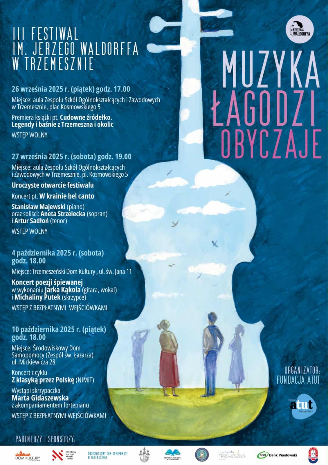 Fundacja Atut zaprasza na III Festiwal im. Jerzego Waldorffa w Trzemesznie. W programie koncerty muzyki klasycznej i operowej oraz poezja śpiewana w wykonaniu wybitnych muzyków, a także premiera książki pt. „Cudowne źródełko. Legendy i baśnie z Trzemeszna i okolic”. Warto zarezerwować sobie czas 26 i 27 września oraz 4 i 10 października.