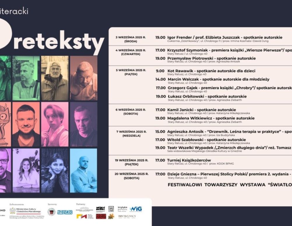 Festiwal zainicjuje niezwykłe spotkanie w kameralnej atmosferze restauracji „Dzieńkowscy” z Igorem Frenderem i prof. Elżbietą Juszczak. Pozostałe rozmowy literackie odbywać się będą już w Starym Ratuszu, a sam program jest niezwykle bogaty: w festiwalowy czwartek Krzysztof Szymoniak zaprasza na premierę swojej najnowszej książki „Wiersze Pierwsze”, a na miłośników kryminałów czeka spotkanie z Przemysławem Piotrowskim. W piątek, 5 września, dzieci i młodzież z gnieźnieńskich szkół zaproszone zostaną na spotkania autorskie z Kotem Rawawikiem i Marcinem Walczakiem, a pozostali gnieźnianie będą mogli wziąć udział w spotkaniu z Grzegorzem Gajkiem promującym najnowszą swoją książkę „Chrobry”. Również w piątek spotkamy się z prawdziwą festiwalową gwiazdą: Łukaszem Orbitowskim, którego chyba żadnemu czytelnikowi przedstawiać nie trzeba.