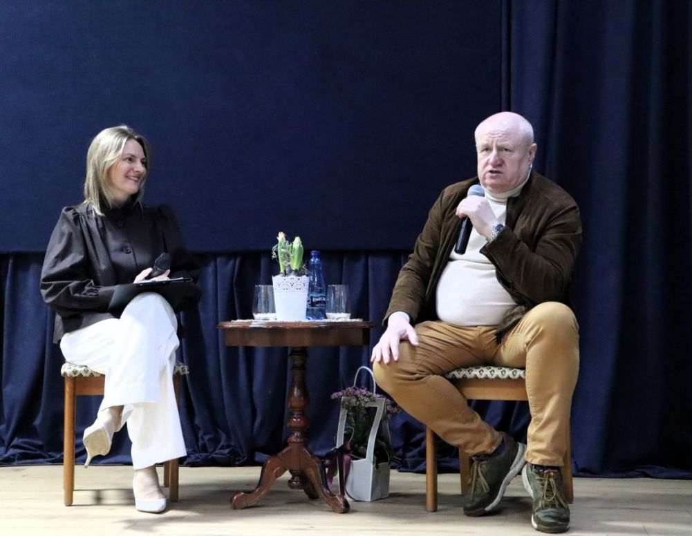 Spotkanie poprowadziła dyrektorka Biblioteki Publicznej, Judyta Talaga. Już na początku pogratulowała pisarzowi świeżo zdobytej nagrody O!Lśnienia w kategorii literatura za powieść „Gołoborze„.