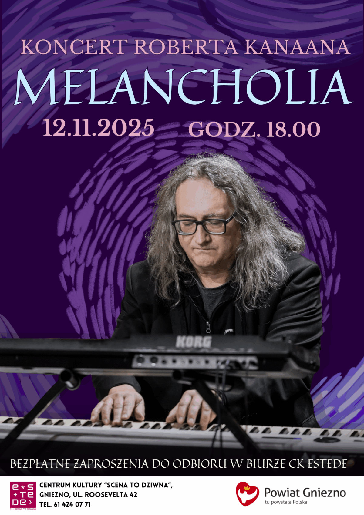 Centrum Kultury „Scena to dziwna” zaprasza na koncert Roberta Kanaana pt. „Melancholia – z tęsknoty za światłem”, który odbędzie się 12 listopada o godz. 18 w sali widowiskowej „eSTeDe”. Bezpłatne zaproszenia do odbioru w CK „eSTeDe”.