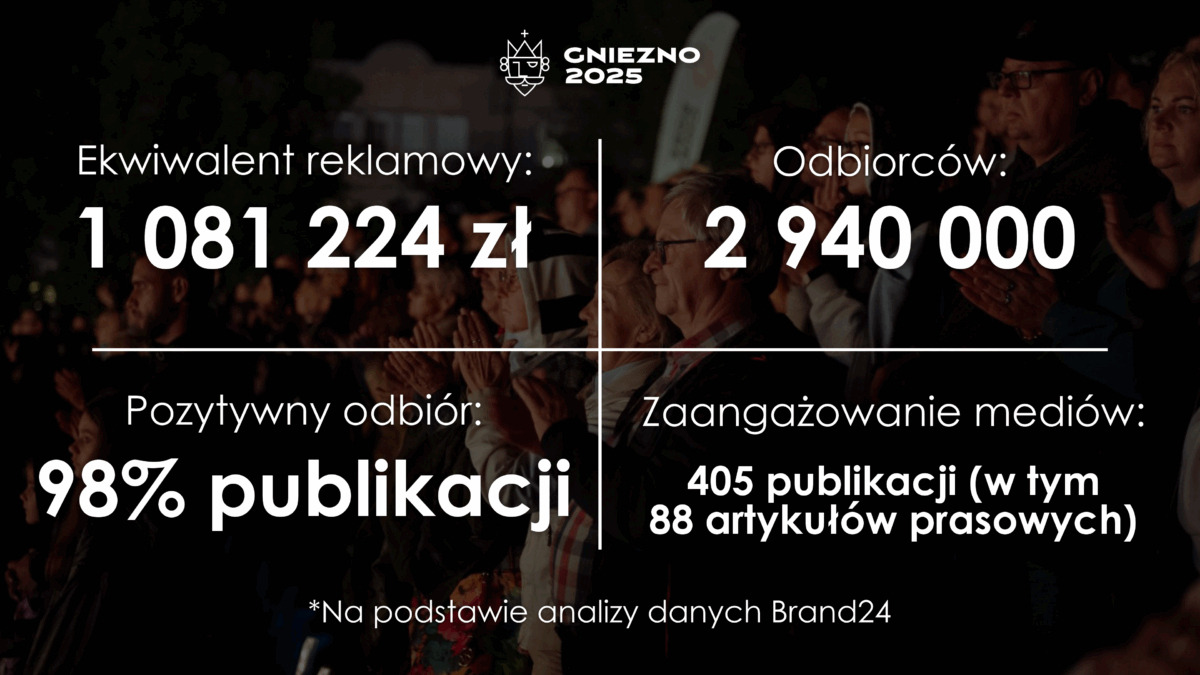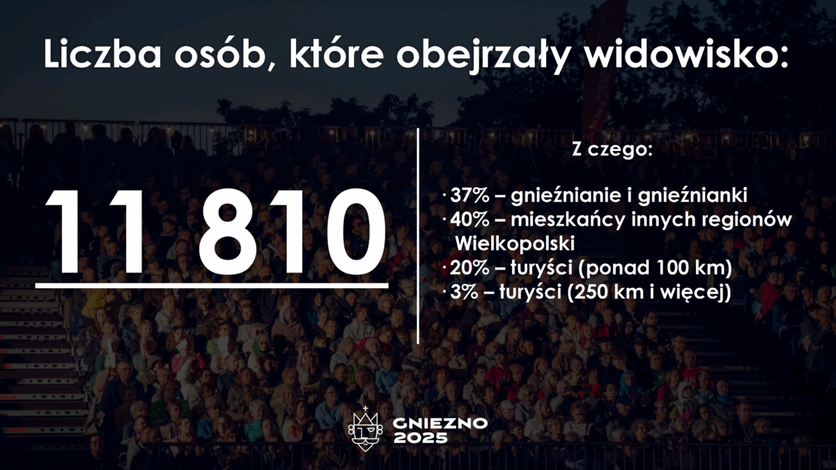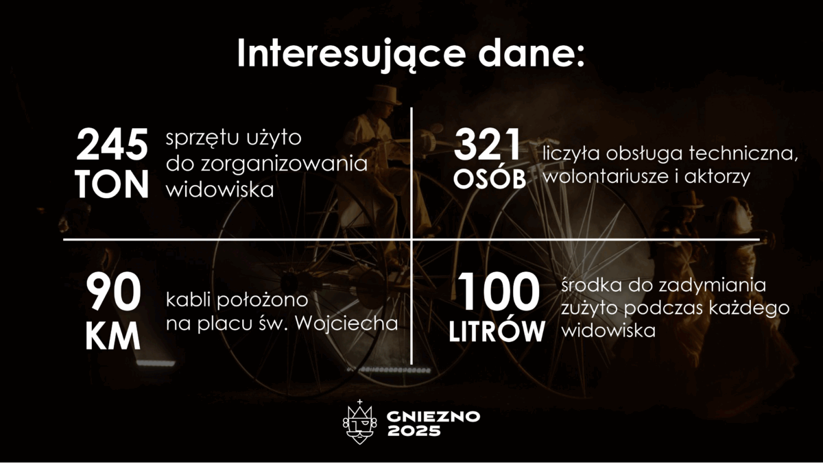 Ponad 11 800 widzów, 6 spektakli, 245 ton sprzętu, 90 kilometrów kabli i 100 litrów środka do zadymiania – tak w liczbach wyglądało plenerowe widowisko „Milenium Koronacji Bolesława Chrobrego”, które przez kilka sierpniowych wieczorów rozświetliło plac św. Wojciecha w Gnieźnie. W realizację wydarzenia zaangażowano 321 osób – od aktorów i wolontariuszy po techników, którzy wspólnie stworzyli jedno z najbardziej spektakularnych przedsięwzięć kulturalnych w historii miasta. Teraz przyszedł czas na podsumowanie tego wydarzenia.