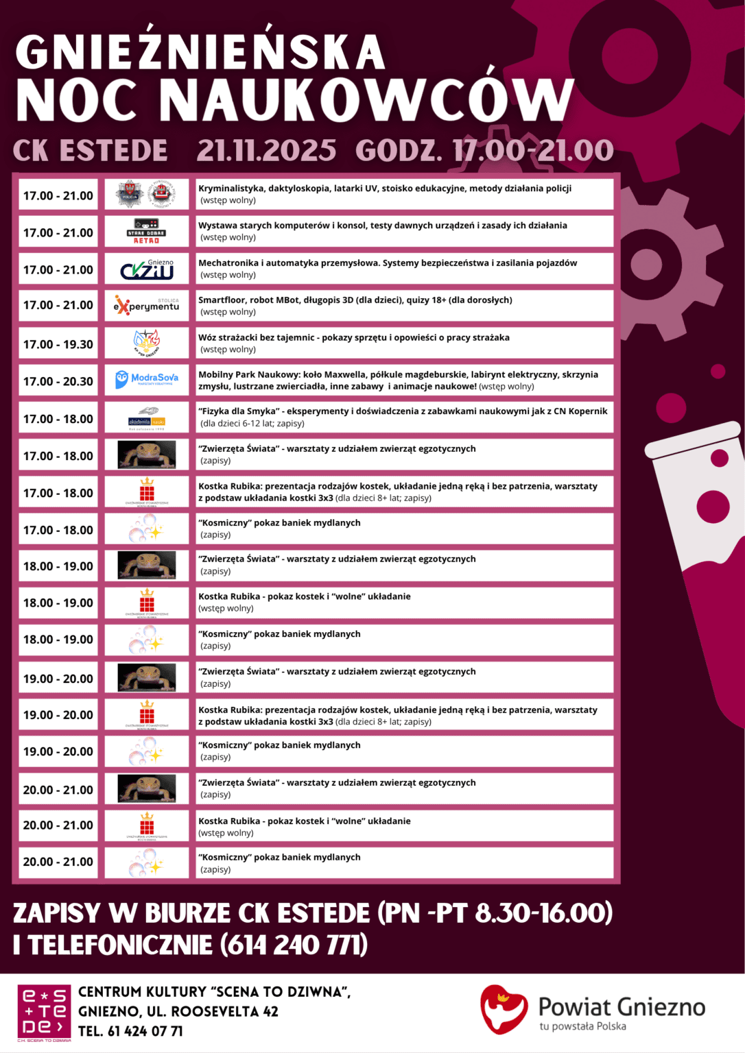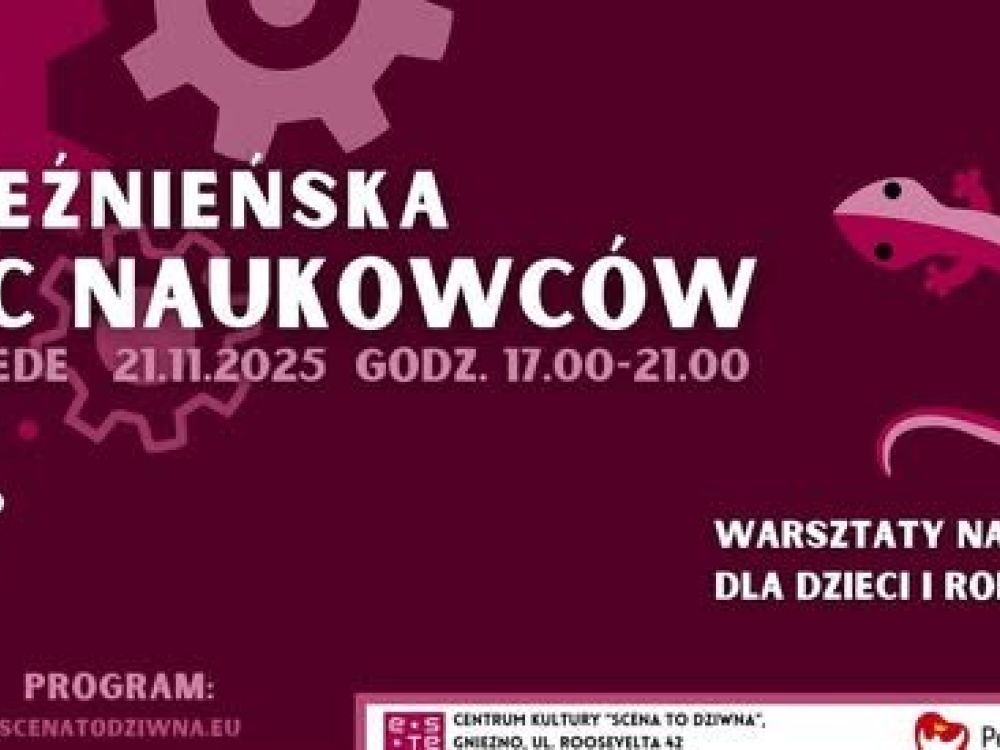 Już w piątek, 21 listopada w godzinach 17 – 21 odbędzie się piąta Gnieźnieńska Noc Naukowców. Centrum Kultury „Scena to dziwna” przygotowało liczne atrakcje, tradycyjnie zapraszając instytucje z powiatu gnieźnieńskiego. Na liście nie mogło zabraknąć partnerów, którzy są z „eSTeDe” od samego początku: CKZiU, Akademia Nauki oraz Stolica eXperymentu z ofertą zarówno dla dzieci, jak i dla dorosłych. Powiatowe i wojewódzkie komendy policji i straży pożarnej zaprezentują pracę służb „od kuchni”. Po raz kolejny na Nocy Naukowców zagości Gnieźnieńskie Stowarzyszenie Kostki Rubika oraz ekipa Starego Dobrego Retro z przekrojem wyjątkowych sprzętów – starych komputerów i konsol, którym wciąż nie brakuje uroku.