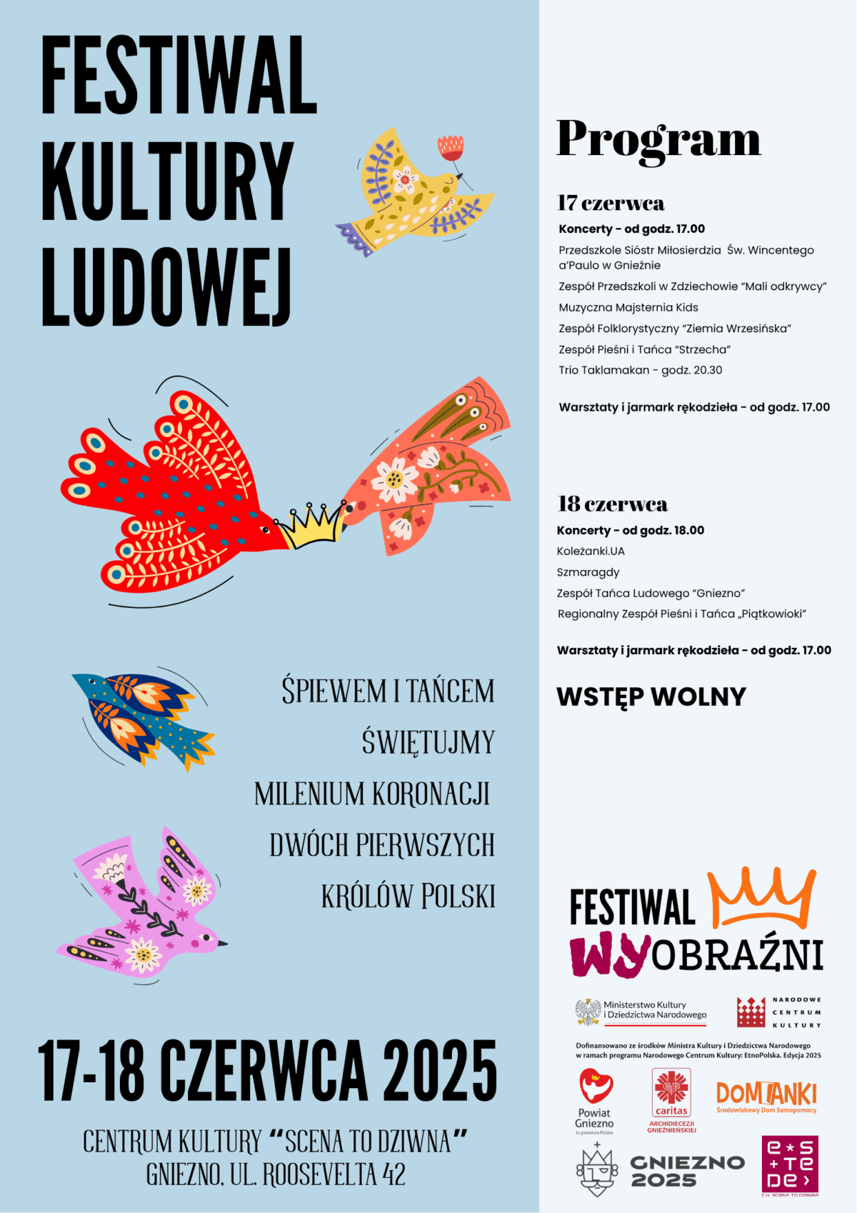 Nieodłączną częścią tegorocznej edycji Festiwalu Wyobraźni jest Festiwal Kultury Ludowej, odbywający się pod hasłem „Śpiewem i tańcem świętujmy milenium koronacji dwóch pierwszych królów Polski”.