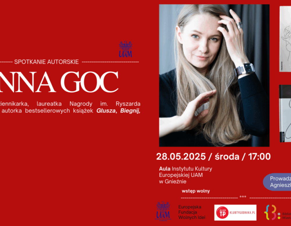 Instytut Kultury Europejskiej UAM oraz Europejska Fundacja Wolnych Idei zapraszają 28 maja na spotkanie autorskie z Anną Goc, wybitną reporterką i redaktorką Tygodnika Powszechnego, autorką książek non-fiction, uhonorowaną jednymi z najważniejszych nagród dziennikarskich i literackich w Polsce.