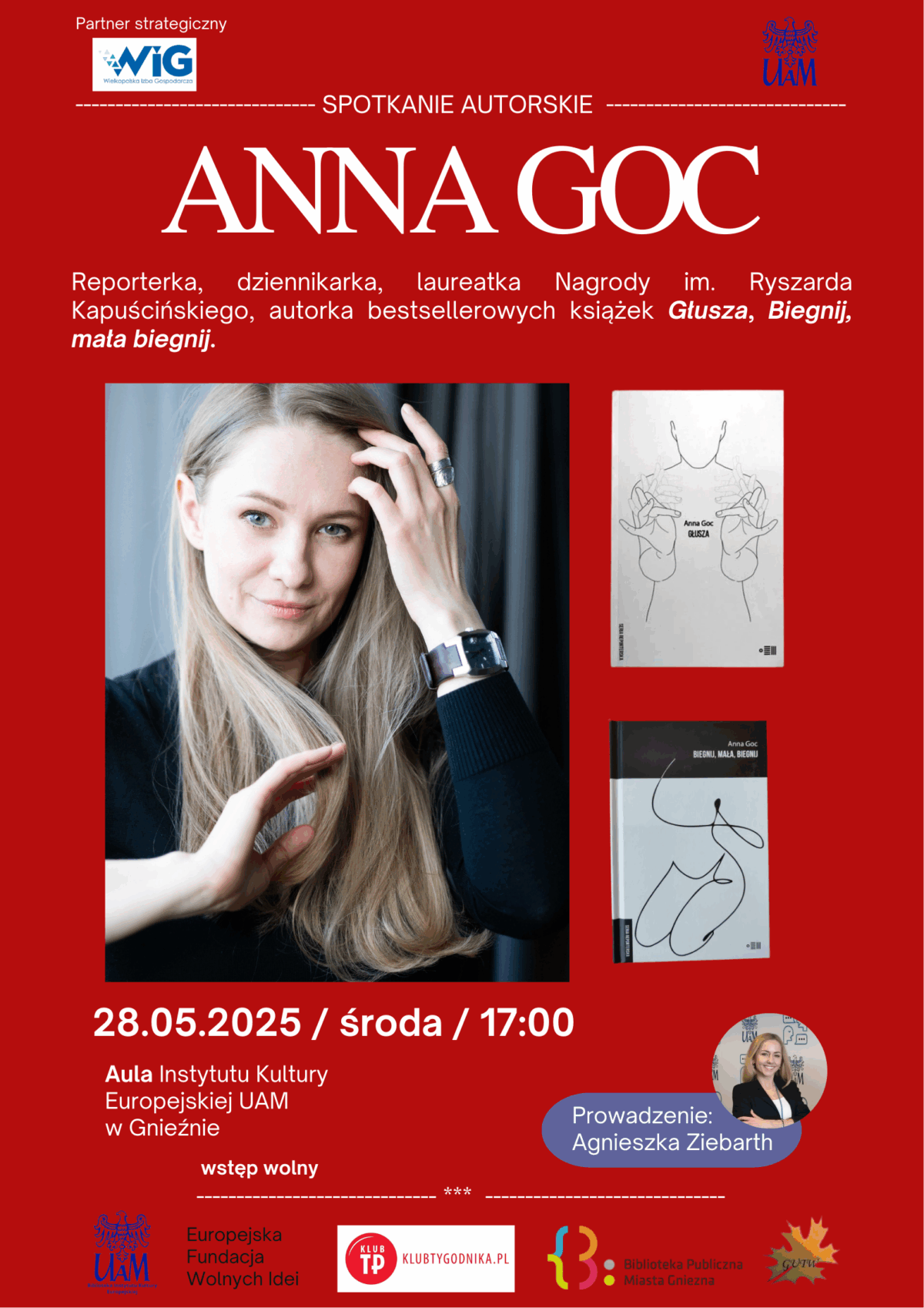 Instytut Kultury Europejskiej UAM oraz Europejska Fundacja Wolnych Idei zapraszają 28 maja na spotkanie autorskie z Anną Goc, wybitną reporterką i redaktorką Tygodnika Powszechnego, autorką książek non-fiction, uhonorowaną jednymi z najważniejszych nagród dziennikarskich i literackich w Polsce.