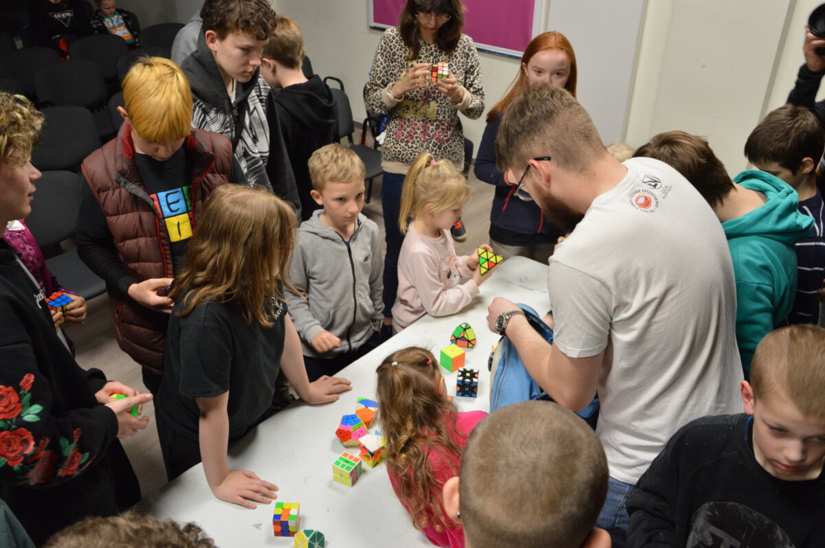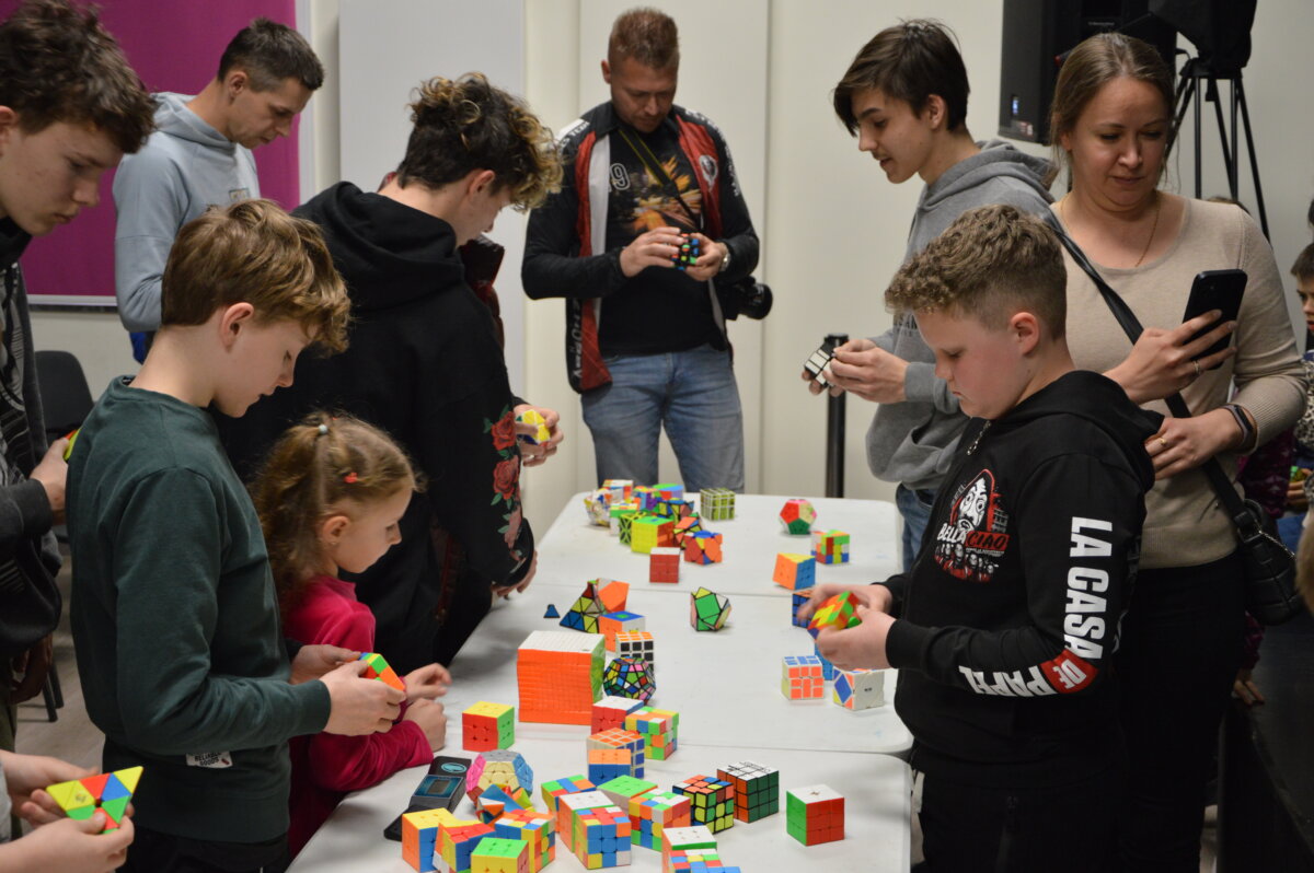 Historia stojąca za powstaniem węgierskiej zabawki to zbiór zaskakujących ciekawostek. Robert i Michał z pasją opowiedzieli zebranej publiczności o wielu typach kostek, które potrafią zaskakiwać liczbą sześcianów, kształtem i sposobem układania. Kombinacji jest wiele – tradycyjna kostka 3×3 to ponad 43 tryliony możliwych kombinacji. Tym bardziej imponujące dla publiczności okazały się rekordy, które wciąż starają się pobić pasjonaci z całego świata. Obecnie mianem najszybszego układacza może poszczycić się Max Park, któremu dwa lata temu zajęło to 3,13 sekundy.