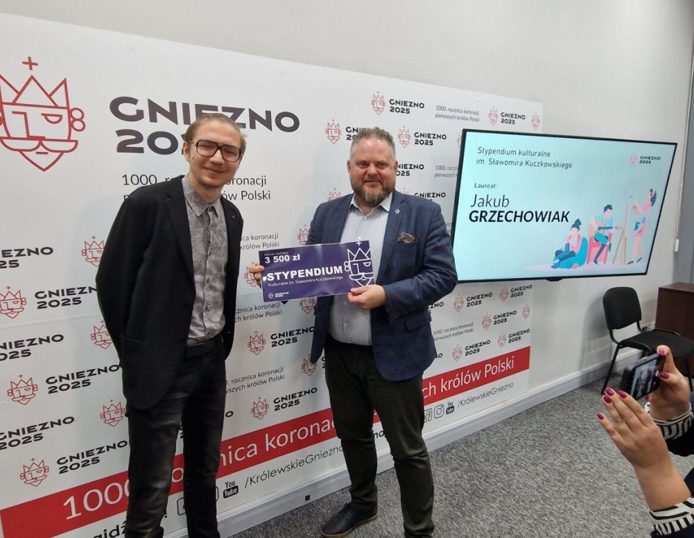 Ostatecznie wybrano pomysł i kandydaturę Jakuba Grzechowiaka. Ten 20-letni muzyk i artysta audiowizualny już dziś, w swoim pokoleniu, jest rozpoznawalny i doceniany. Jest członkiem zespołu Père-Lachaise, młodej rockowej fali naszego miasta, w którym gra na klawiszach i syntezatorach, ale też produkuje muzykę innych gnieźnieńskich młodych twórców, jak Wiwi czy Agata Wesołowska. Tworzy podkłady muzyczne, jingle, a sam debiutuje w tym roku ze swoim własnym muzycznym materiałem. – Bardzo się ucieszyłem z wieści o tym stypendium – mówi laureat wyróżnienia odbierając z rąk wiceprezydenta miasta symboliczny czek na 3500 złotych. Ponieważ idea Stypendium im. Sławomira Kuczkowskiego jest konkretna i niezmienna – przyznawane jest ono „na coś”, a nie „za coś”, młody twórca wygrał pomysłem na projekt pn. „Made in Gniezno”. – Chcę w nim sportretować pięciu artystów i ująć to, co czuli tworząc w tym mieście – dodaje. Wymienia tu Teresę Łubińską-Kalinowską (artystka zajmująca się tkaniną artystyczną), Sławomira Kuczkowskiego (patron stypendium, poeta), Klemensa Waberskiego (muzyk, kompozytor), Jerzego Sieczkowskiego (fotograf) i Marcelego Derengowskiego (malarz). Dziś, tych wybitnych postaci nie ma już z nami, ale mają powrócić do społecznej pamięci gnieźnian ponownie. Skąd zatem ten pomysł? – Widziałem mural na „Wenecji” z postaciami ludzi kultury naszego miasta. Pomyślałem i przyznałem – choć działam w kulturze miasta może niedługo – że nie kojarzę tych ludzi. Poczytałem o nich i o tym, co tworzyli i zwaliło mnie to z nóg! – nie kryje entuzjazmu Jakub.