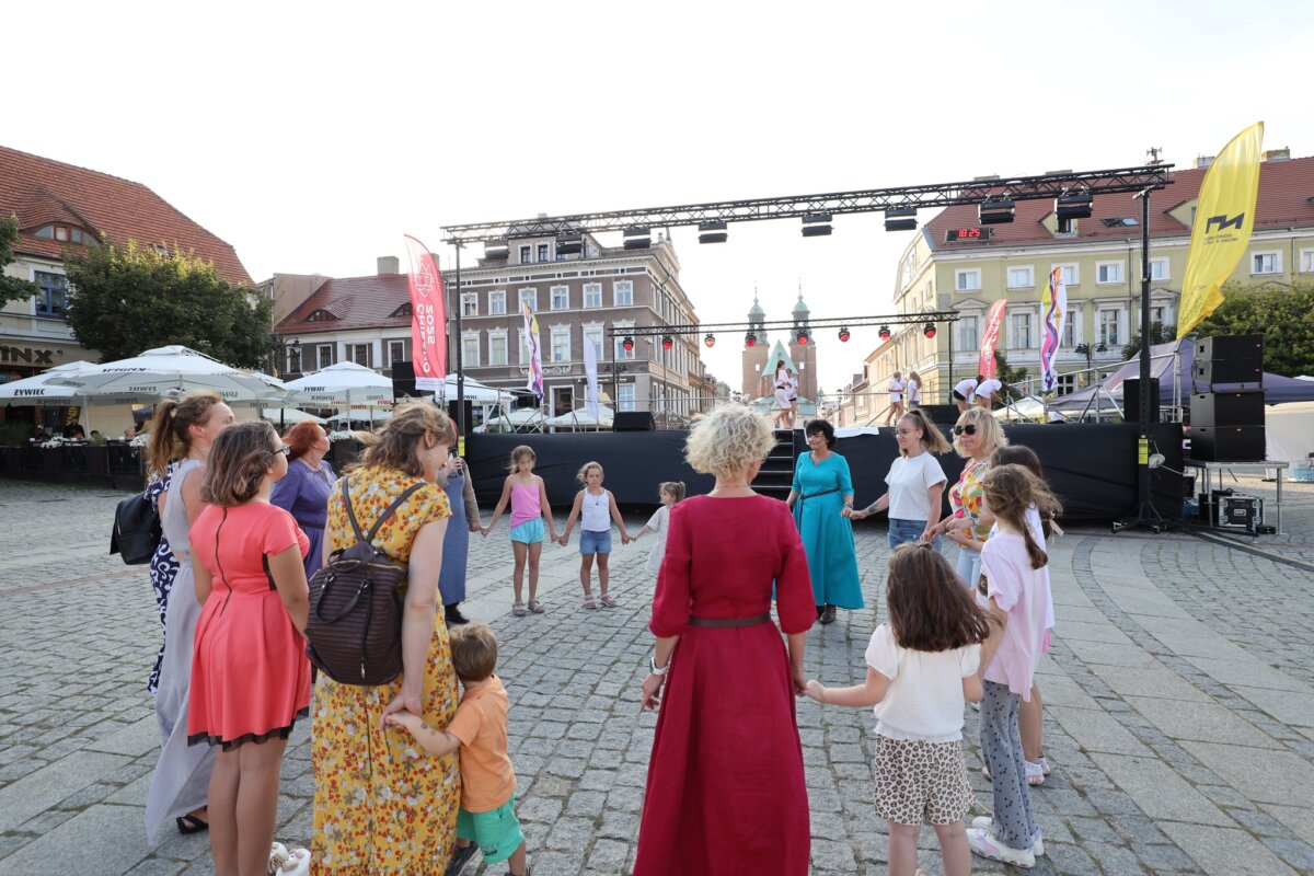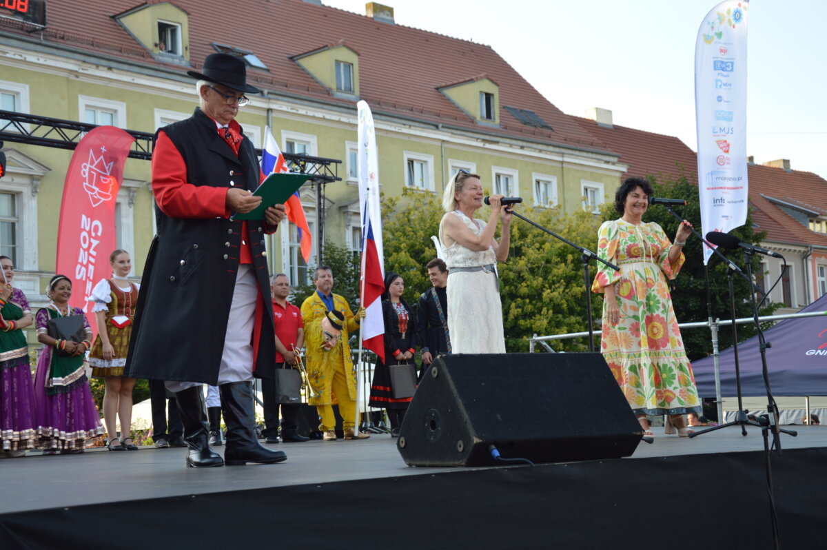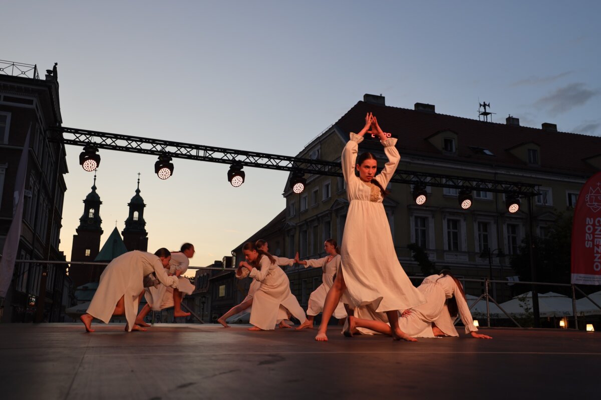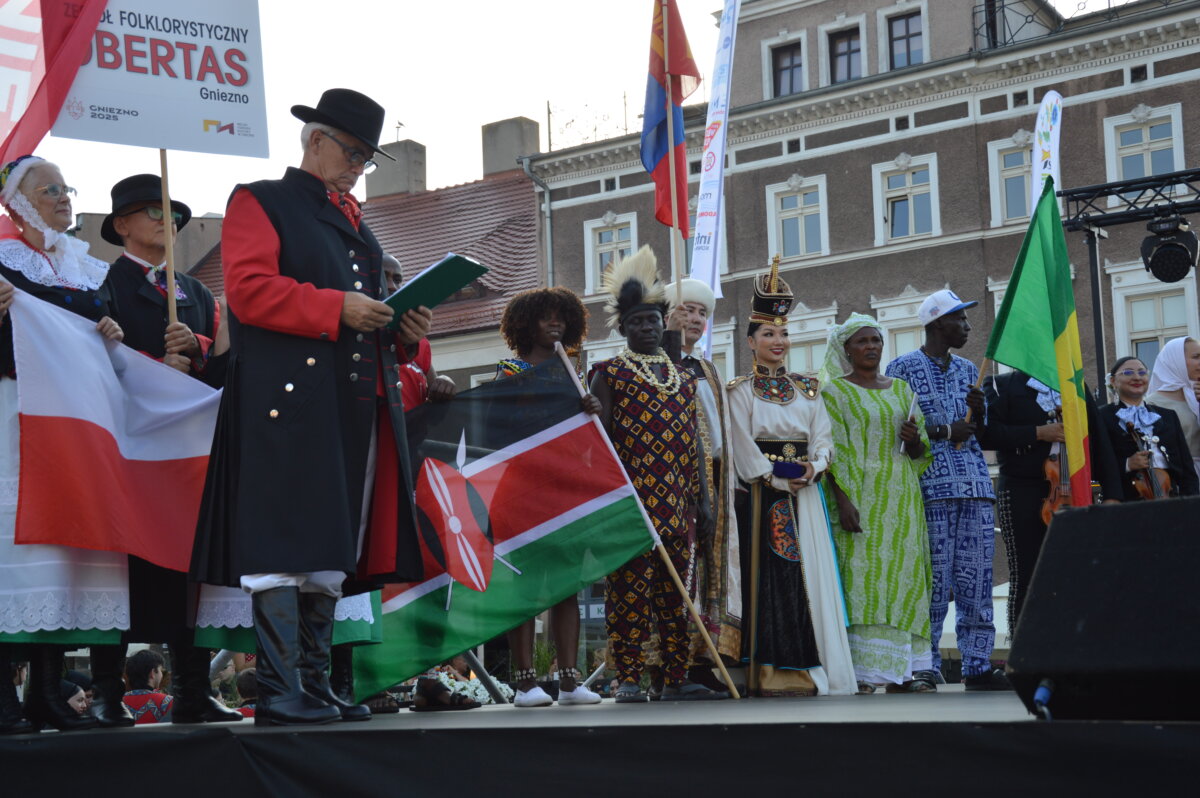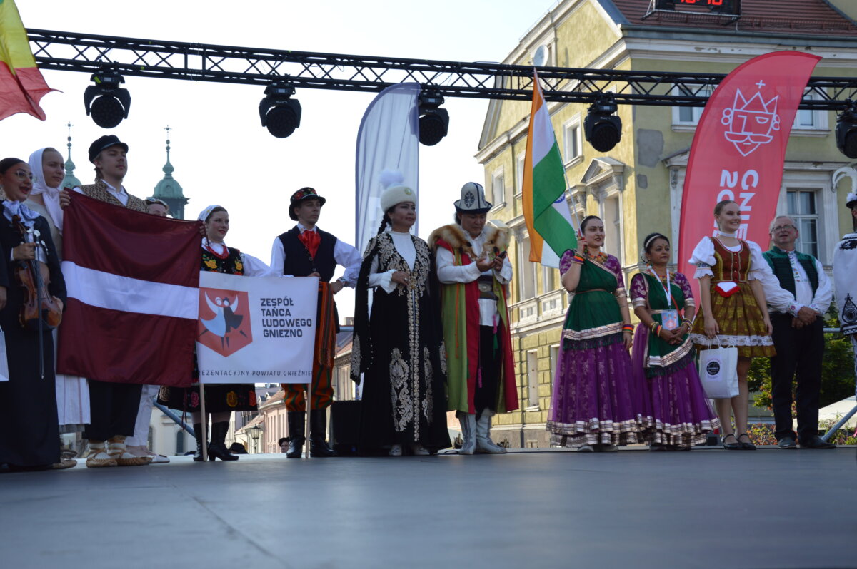 W piątkowe popołudnie i wieczór na gnieźnieńskim rynku można było zobaczyć zespoły taneczne z całego świata: z Kenii, Mongolii, Meksyku, Łotwy, Słowacji, Indii, Senegalu, Kirgistanu, Chile i Gruzji. W tej podróży nie zabrakło także przedstawicieli Polski, którą reprezentowały lokalne zespoły ludowe: Zespół Folklorystyczny „Obertas” i Zespół Tańca Ludowego „Gniezno”. Podczas występów publiczność mogła zanurzyć się w różnorodność ludowych tradycji i obyczajów, pochodzących z najdalszych zakątków świata. Scena tętniła życiem dzięki barwnym kostiumom, autentycznym brzmieniom muzyki etnicznej oraz dynamicznym występom tanecznym, które oddawały ducha i charakter poszczególnych kultur. Całość wydarzenia przebiegała w serdeczne, pełnej entuzjazmu atmosferze, sprzyjającej budowaniu międzynarodowych relacji i wspólnemu świętowaniu.