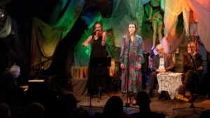 W jednej z rozmów Wacław Krupiński zatrzymał się przy zbiorze aforyzmów, odsłaniając przed publicznością także ten wymiar twórczości poety. W oprawie muzycznej spotkania udział wzięli muzycy związani z Piwnicą pod Baranami: Walentyn Dubrowskij– fortepian, Oleg Dyyak– akordeon oraz Agata Półtorak – skrzypce. Towarzyszyli oni wokalistom, także związanym z Piwnicą, tworząc z nimi charakterystyczną dla tego miejsca nastrojowość i teatralny klimat. Ciekawostką wieczoru było przedstawienie wierszy przez poetę tuż przed ich wykonaniem wokalnym. W ten sposób słowna interpretacja utworu spotkała się z jego muzycznym brzmieniem. Zwieńczeniem wydarzenia było wykonanie tytułowej piosenki „Zanim odnajdą głos” w interpretacji Michała Kamińskiego, które domknęło kompozycję całego programu i stanowiło jego kulminacyjny moment. Po tym występie Sławomir Krzyśka zaprezentował kilka wierszy z powstającego tomiku, do którego ilustracje wykonał również Sebastian Kudas.
