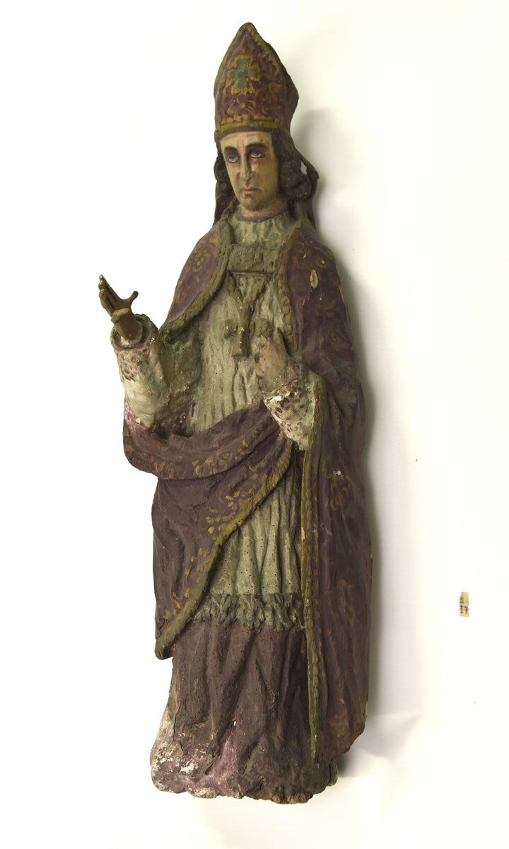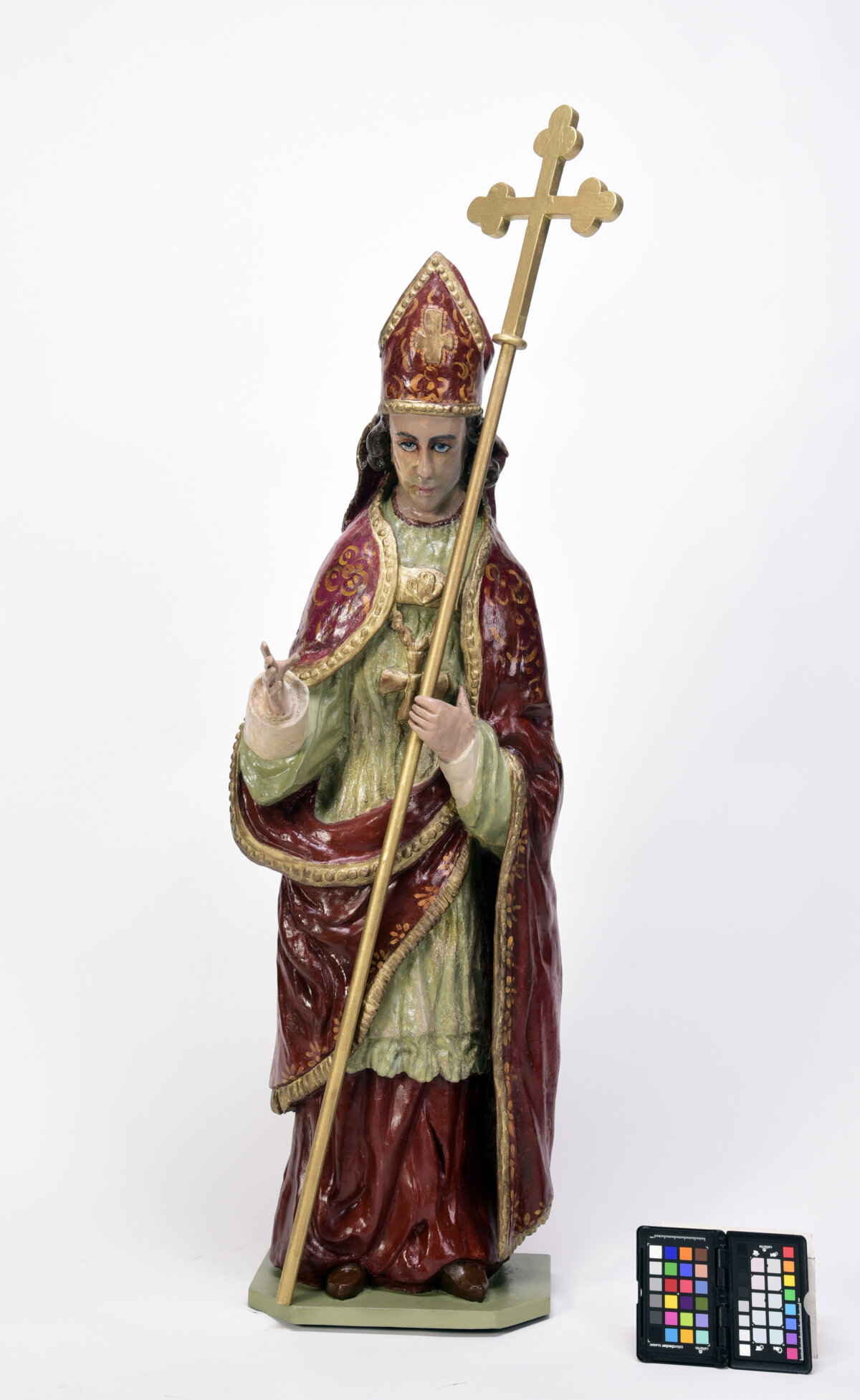 Figura Biskupa, o numerze inwentarzowym MPP EH 461, z wystroju dawniejszego ołtarza, przedstawia duchownego w stroju pontyfikalnym, z lekko pochyloną głową, przytrzymującego lewą ręką połę płaszcza, a prawą ugiętą i wysuniętą do przodu. Rzeźba miała ubytki, zabrudzenia, nosiła tez ślady nieprofesjonalnych uzupełnień i przemalowań. Została oczyszczona z zabrudzeń, częściowo usunięto z niej przemalowania. Zdjęto również wykonane z gipsu uzupełnienia w partii prawej dłoni oraz w dolnej części przy podstawie. Zdezynfekowano i zaimpregnowano drewno, wypełniono spękania i ubytki drewna masą drzewną i flekami. Wykonano snycerskie uzupełnienia ubytków lewej dłoni. Inne ubytki (między innymi w dolnej partii postaci) uzupełniono żywicą. Uzupełniono i zrekonstruowano warstwę malarską. Zrekonstruowano też atrybut świętego w postaci krzyża. Figura została ponownie ustabilizowana.