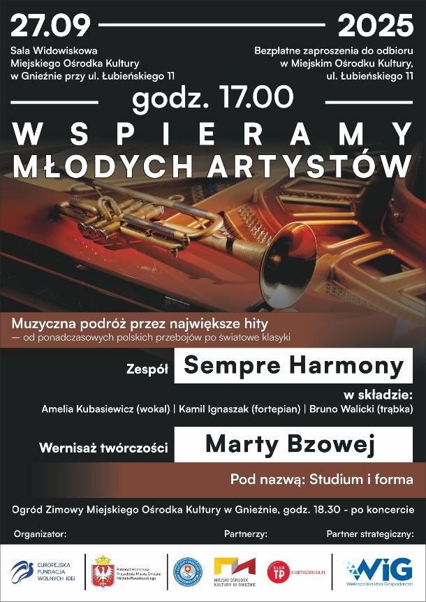 Już 27 września (sobota), w Miejskim Ośrodku Kultury w Gnieźnie odbędzie się wyjątkowe wydarzenie kulturalne o nazwie „Wspieramy Młodych Artystów”, na które bezpłatne zaproszenia dostępne są w MOK. Tego dnia publiczność będzie mogła zobaczyć dwie formy sztuki – muzyczną, a następnie plastyczną.