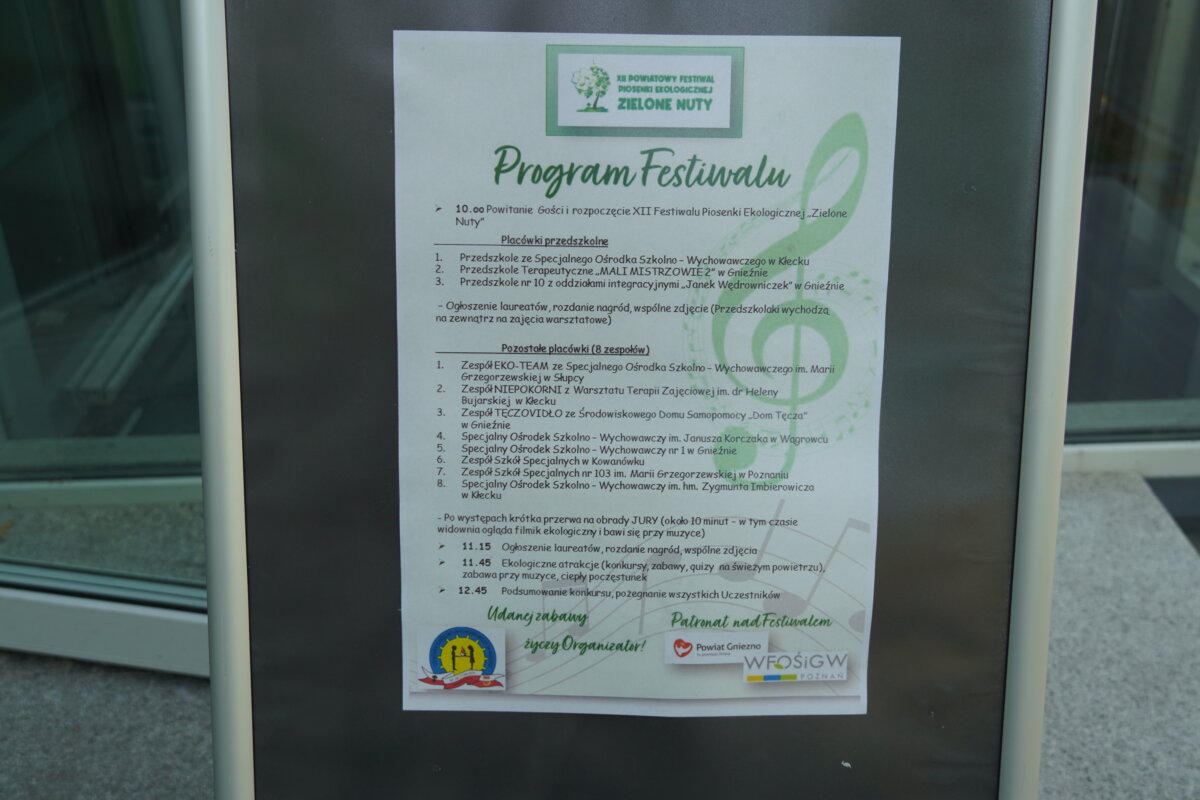 Chociaż projekt „Zielone Nuty” w nazwie ma „powiatowy”, to jednak jego zasięg wykroczył poza powiat gnieźnieński. – Festiwal charakteryzują imponujące liczby: dwunasta edycja i aż jedenaście zespołów biorących udział w tym wydarzeniu dzisiaj. Ma też ponadlokalny zasięg, bowiem występują zespoły z Poznania, Kowanówka, Wągrowca, czy Słupcy. Budujące jest to, że ci młodzi ludzie pasjonują się ekologią, śpiewają o niej, zachęcając nas do dbania o środowisko naturalne – powiedziała Ewa Barłoga–Purol z Zarządu Powiatu Gnieźnieńskiego. Każdy występ wzbudzał duże, pozytywne emocje zarówno wśród wykonawców, jak i publiczności. Wszyscy zostali nagrodzeni, nie przyznawano zatem miejsc. Jury oceniało tylko występy w kategoriach m.in. scenografia oddająca treść piosenki, stroje wykonawców, wyraz artystyczny. Po występach dla uczestników przygotowano atrakcje na świeżym powietrzu (konkursy, zabawa przy muzyce, quizy) oraz poczęstunek. Było radośnie, kolorowo… i – oczywiście – ekologicznie. Organizatorami festiwalu były: Specjalny Ośrodek Szkolno–Wychowawczy im. hm. Zygmunta Imbierowicza w Gnieźnie i Starostwo Powiatowe w Gnieźnie – Wydział Ochrony Środowiska Leśnictwa i Rolnictwa. Patronat honorowy: Starosta Powiatu Gnieźnieńskiego.