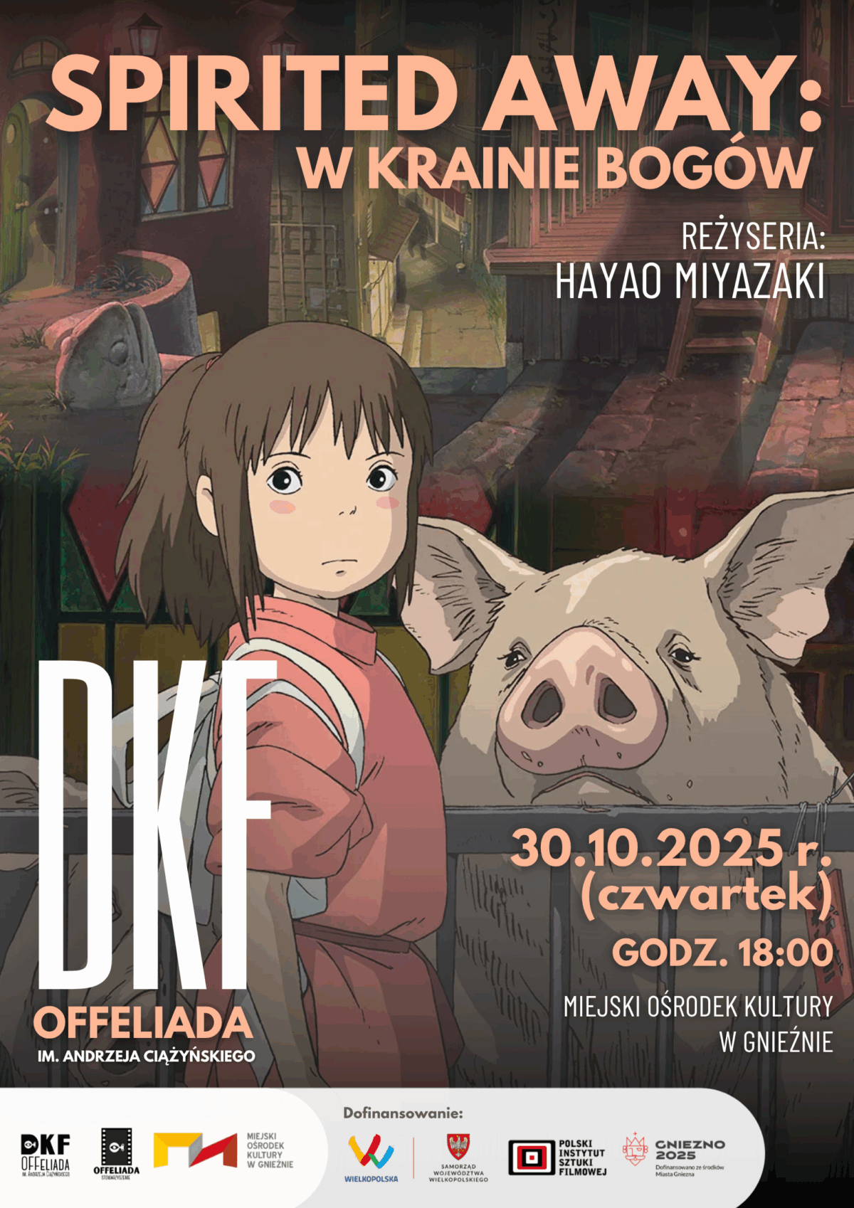 DKF Offeliada im. Andrzeja Ciążyńskiego zaprosi wówczas na projekcję „Spirited Away: W Krainie Bogów” (org. „Sen to Chihiro no kamikakushi”). To nagrodzone Oscarem animowane arcydzieło w reżyserii Hayao Miyazakiego opowiada historię małej dziewczynki o imieniu Chihiro, która gubi się w świecie duchów, aby uratować swoich rodziców zamienionych w świnie. Film jest świetnym sposobem, by rozpocząć swoją przygodę ze światem anime, który jest pełen niesamowitych i pięknych opowieści czekających tylko na odkrycie.