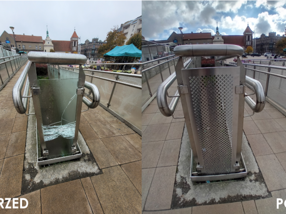 W ostatnich tygodniach doszło do zniszczenia wielu szyb w balustradach miejskiego targowiska od strony ul. św. Wawrzyńca. Do takich sytuacji dochodziło już wcześniej ale takiej skali jak niedawno – nie odnotowano od początku oddania inwestycji do użytku. Najczęściej straty powodowali młodociani miłośnicy hulajnóg i rowerów bawiący się wieczorami na placu. Jednak nikt za to odpowiedzialności nie poniósł. Urząd Miejski zdecydował jednak, by szklanych elementów nie wymieniać już na takie same lecz wymieniać je na trwalszą blachę perforowaną. Właśnie zakończył się pierwszy etap tych prac, obejmujący wymianę 40 przęseł. – Mamy nadzieję, że te zmiany zostaną uszanowane przez mieszkańców i odwiedzających targowisko, a Miasto nie będzie musiało ponownie wydawać publicznych środków na naprawy – komentuje Michał Powałowski prezydent Gniezna. By nie dochodziło do dalszych dewastacji, Straż Miejska zamontowała już nową kamerę od strony najbardziej ulegającej dewastacjom, a niebawem całe targowisko zostanie objęte nowym systemem monitoringu z wykorzystaniem systemów AI. Dalsze prace związane z wymianą przęseł będą kontynuowane w roku przyszłym.