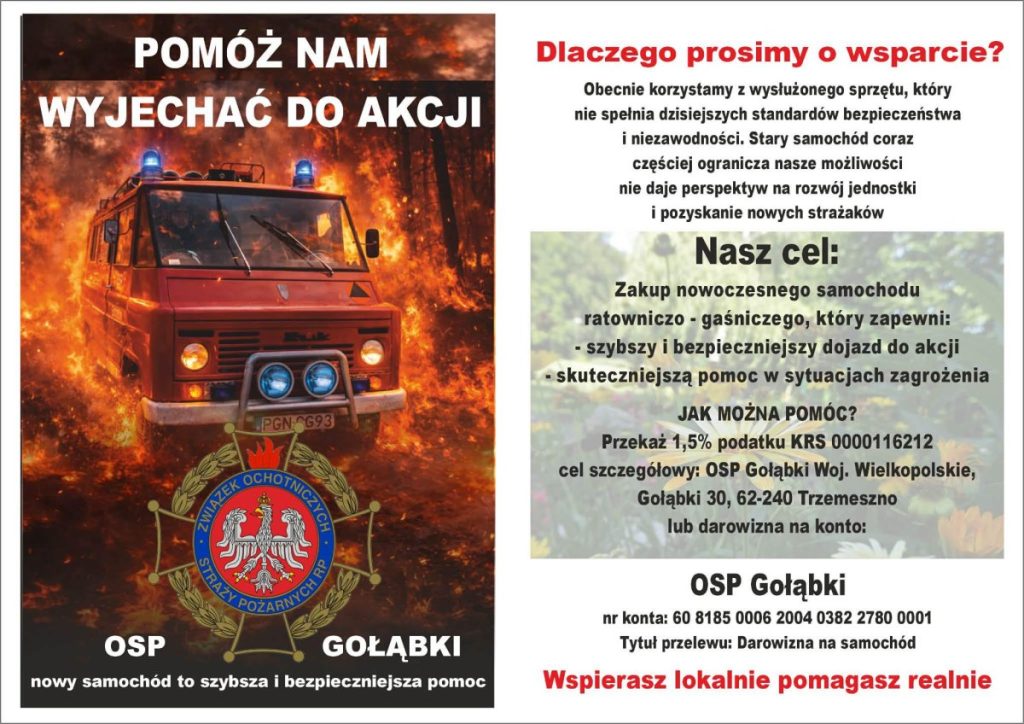 Oprócz zbiórki publicznej na portalu, OSP przypomina również, że każdy chętny może wesprzeć jednostkę przekazując 1,5% podatku. To nic nie kosztuje, a realnie wzmacnia budżet strażaków‑ochotników. W zeznaniu podatkowym należy podać nr KRS 0000116212, a w rubryce Cel szczegółowy należy wpisać OSP GOŁĄBKI. Ponadto istnieje możliwość przekazania darowizny bezpośrednio na konto jednostki nr: 60 8185 0006 2004 0382 2780 0001. W tytule przelewu należy wpisać Darowizna na samochód.