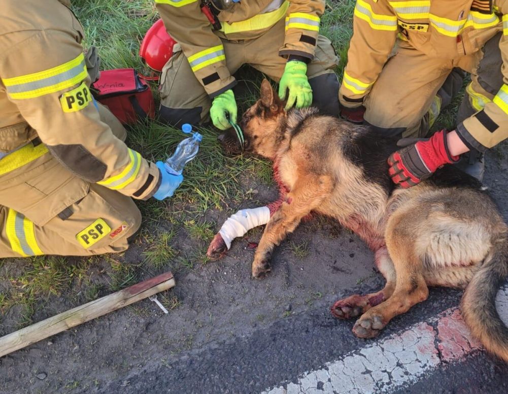 Gdy zwierzę znajdzie się na drodze, to w konfrontacji z pędzącym samochodem nie ma zazwyczaj żadnych szans. Mimo takiego zdarzenia pod Wrześnią i w dodatku zaklinowania się psa pod samochodem, strażacy zdołali go odratować.
