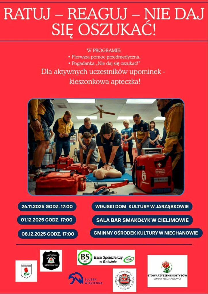 Stowarzyszenie Sołtysów Gminy Niechanowo zaprasza mieszkańców do wzięcia udziału w akcji profilaktycznej pod hasłem „RATUJ, REAGUJ, NIE DAJ SIĘ OSZUKAĆ”, poświęconej edukacji mieszkańców w zakresie pierwszej pomocy przedmedycznej oraz bezpieczeństwa. W ramach wydarzenia zaplanowano część szkoleniową oraz prewencyjną realizowaną we współpracy z druhami Ochotniczej Straży Pożarnej w Niechanowie, funkcjonariuszami Komendy Powiatowej Policji w Gnieźnie oraz funkcjonariuszem Zakładu Karnego w Gębarzewie. Uczestnicy będą mieli możliwość zapoznania się z zasadami udzielania pierwszej pomocy przedmedycznej, sposobami reagowania w sytuacjach zagrożenia życia oraz aktualnymi metodami działania oszustów, na które narażeni są mieszkańcy – zwłaszcza osoby starsze. Wydarzenie odbywa się pod patronatem Banku Spółdzielczego w Gnieźnie, który wspiera działania edukacyjne na rzecz poprawy bezpieczeństwa lokalnej społeczności. Celem akcji jest podniesienie świadomości mieszkańców gminy w zakresie ratownictwa przedmedycznego oraz wzmocnienie ich bezpieczeństwa poprzez rzetelną wiedzę i praktyczne umiejętności.