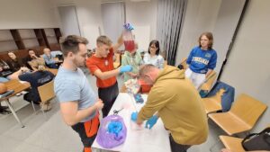 Spotkanie pierwsze obejmowało: nagłe zatrzymanie krążenia, zadławienia – jak rozpoznawać, jak udzielać pomocy z wykorzystaniem defibrylatora AED oraz manekinów. Na wstępie prowadzący przeprowadzili krótki test sprawdzający posiadaną dotychczas wiedzę na temat udzielania pierwszej pomocy. Dzięki otrzymanej dotacji uczestnicy mogli sprawdzić skuteczność podejmowanych działań dzięki nowej aplikacji do AED oraz kamizelki do nauki postępowania w przypadku zadławienia.