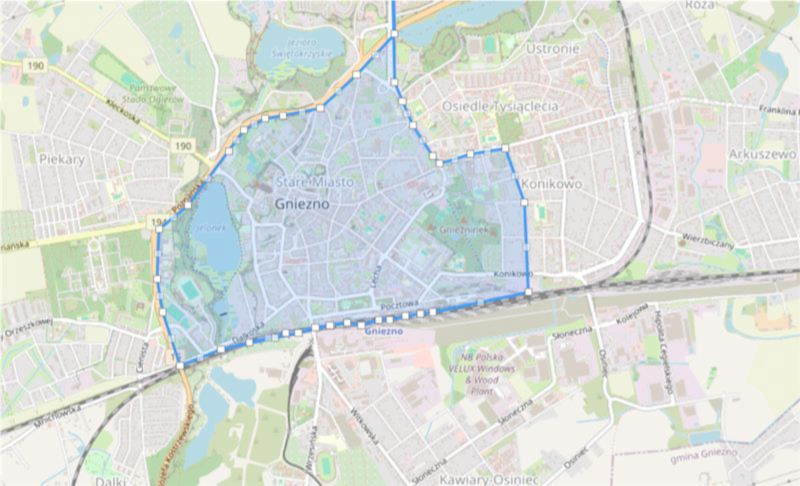 a) od północy: trasą Zjazdu Gnieźnieńskiego od skrzyżowania ulic Józefa Kostrzewskiego i Poznańskiej do Wiaduktu Solidarności,
