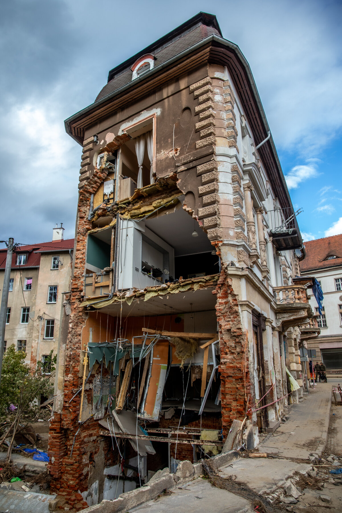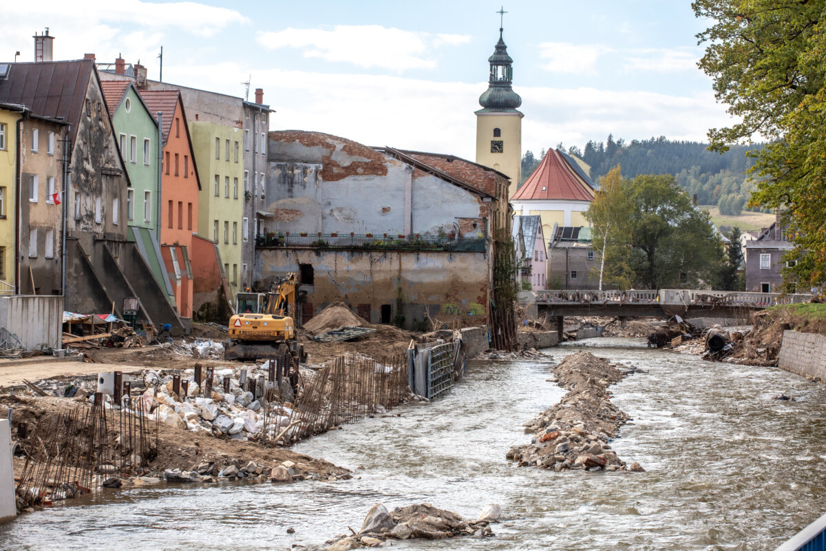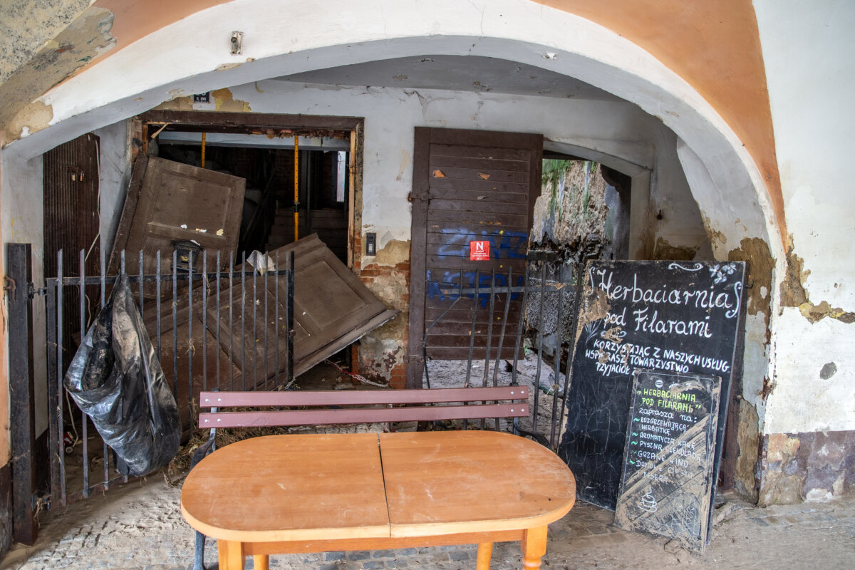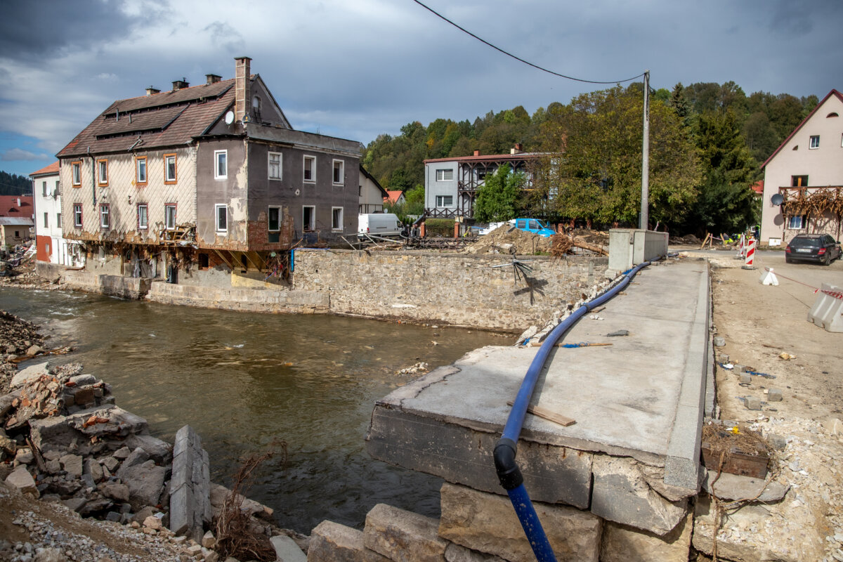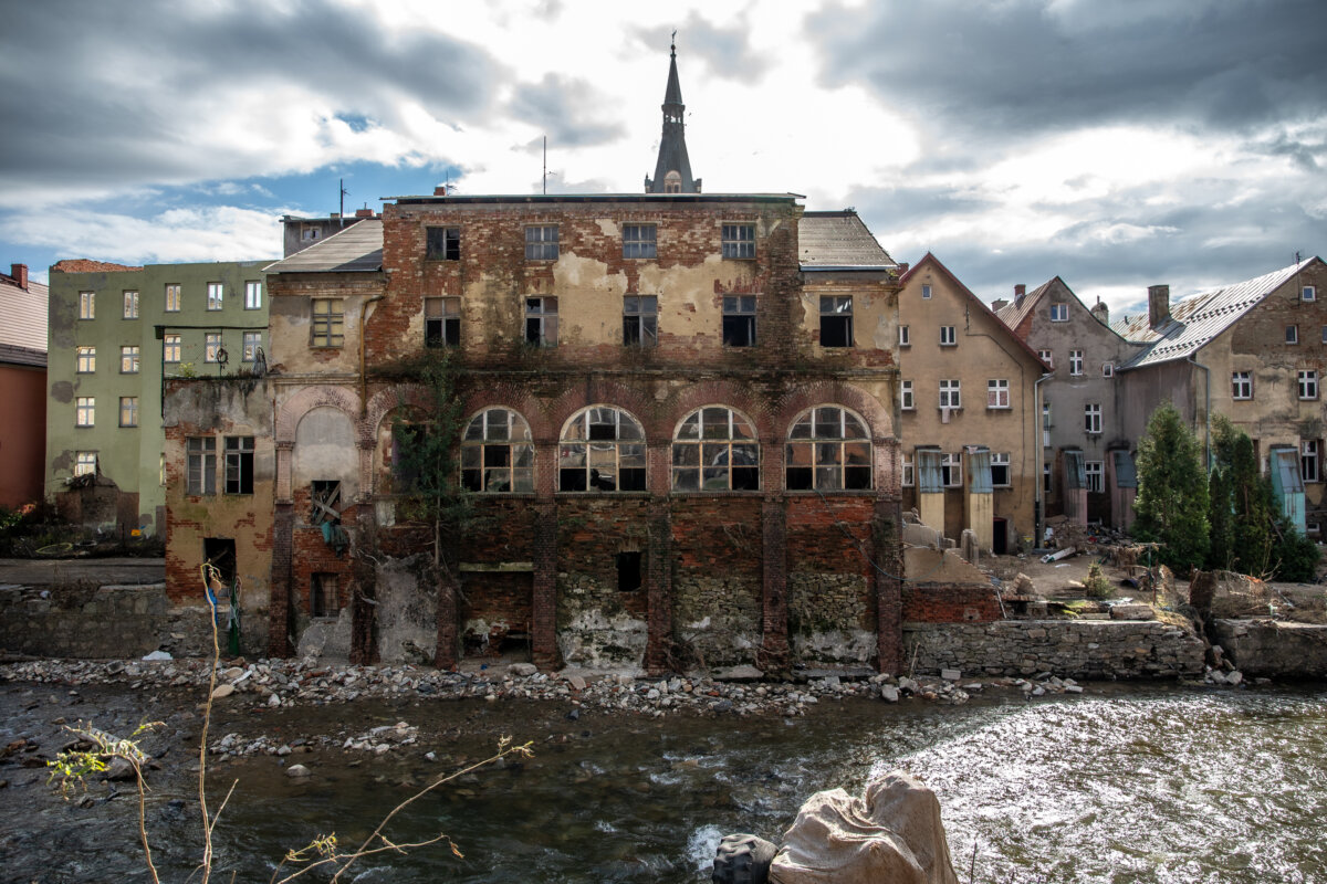 To chyba aura wzmogła w nas poczucie jakiejś grozy, choć świeciło pełne słońce, wiatru niemal nie było, a temperatura sięgała 16 stopni. Przyznaliśmy z Piotrem, że wjeżdżając na Rynek, poczuliśmy się jak w westernowych filmach. Wszędobylska żółć, jakbyśmy przez filtr kamery patrzyli. Bruk zasłany żółtym pyłem, słońce odbija się od spękany żółtych elewacji niskich kamieniczek. Witryny sklepów bez okien i drzwi, gdzieniegdzie bujają się skrzypiące ich ramy bez szyb. Pusto. Przeraźliwie pusto. Na środku Rynku stoi kilka brudnych aut, cztery wojskowe ciężarówki, kilka Toi-Toi i kuchnia polowa w której nie ma ruchu. Wojskowi kucharze i wolontariusze, siedząc na krzesłach, nudzą się wyraźnie. Gdzie podzieli się ludzie? Zachodnia pierzeja Rynku ma cudne, choć mocno zapuszczone podcienia. Miejscowi mówią na nie po prostu „pod filarami”. Woda w czasie powodzi zalała je po same sklepienia. Będą ze 3 metry. Idziemy na Most Złotostocki, który znajduje się od „filarów” może z 20 kroków. Pod nim płynie Biała Lądecka. Właściwie nie pod nim, ale po tym, co z mostu pozostało. To jedyna czynna przeprawa nad rzeką w promieniu pewnie kilometra. Konstrukcja z 1928 roku, choć już bez barierek, w części oberwana, jeszcze dźwiga ludzi i samochody. W centralnej części miasteczka rzeka jest ujęta w kamienne ramy, za którymi wznoszą się domy i kamieniczki. Kiedyś były tu także mniej lub bardziej zagospodarowane bulwary. Dziś ich nie ma. To kompletna ruina. Bruk, asfalt, drzewa i krzewy porwała stąd woda. Stojąc na moście, jak sięgnąć okiem, wzdłuż rzeki gruzowiska. Dosłownie, jakby przywieziono tu ze zburzonego miasta jego okruchy i rozsypano jak popioły nad rzeką. Ponury widok. Malowniczo usytuowany nad samą rzeką dom przy ul. Widok, który zwisa kondygnacjami nad rzeką, poszarpany i zniszczony do wysokości pierwszego piętra. To i tak cud, że stoi, kiedy wokół niego ciężkie kamienne bryły woda wyrwała z betonowego podłoża. Jaki los czeka dom? „Zakaz wstępu” namalowany na elewacji chyba to przesądza.