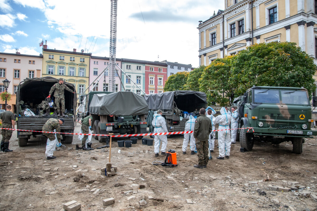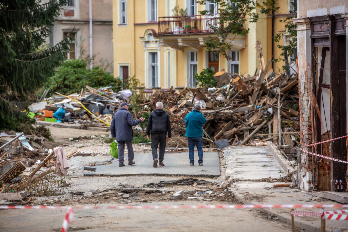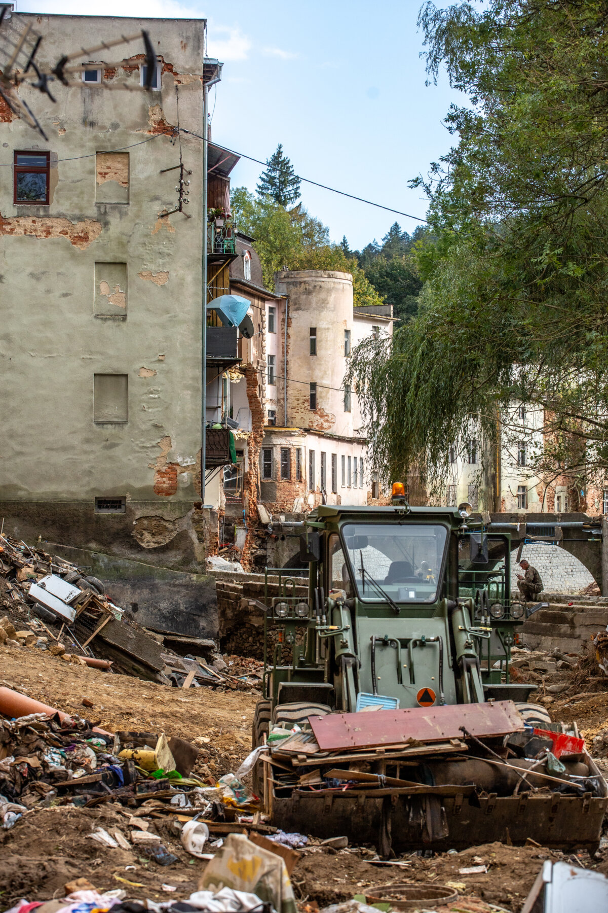 Zatem jedziemy. Nasz rozmówca ostrzegał, że widok jest straszny. Wojenny. Parkujemy przy Zakładzie Przyrodoleczniczym „Jerzy”. Budynek ostał się nienaruszony, ale wszystko poniżej sąsiedniej ulicy Kościuszki jest obrazem rozpaczy. Nie ma tu prawie żadnych mieszkańców. Tylko wojsko. Ścisła, wysoka i piękna zabudowa domów zdrojowych i kamienic, wygląda jak martwe miasto. Wyparowało gdzieś 5 tys. mieszkańców Lądku. Zalane partery lokali i ruina podwórek i ulic – to już widzieliśmy niżej w części rynkowej i w Kłodzku, ale część ulokowana przy Białej Lądeckiej to destrukt. W części zburzone domy, a w uliczkach dziwaczne konstrukcje z naniesionych ze Stronia Śląskiego przedmiotów. Wyżej położone Stronie niemal zniknęło z wodą. Wszystko to poszło właśnie na zdrój Lądku. W kamienice wpadały dachy, kamienie, samochody, drzewa. Wschodzimy na ruinę mostu w ciągu ul. Paderewskiego. Na tym zakręcie woda „wyburzyła” część kamienicy. Widzimy stąd fragment niedawnego życia jakiejś rodziny. Kuchnia i salon odsłonięte, bez jednej ściany. W tle słychać tylko wojskowe koparki, które spychają gruz. Przechodzi ratownik z psem. Jak mówi, przeczesują gruzy i kamienice. Szukają ludzi. Ostrzega by nie zbliżać się do niedalekiego domku z pruskiego muru. Codziennie przechyla się i może runąć do rzeki. Nie mamy wiele czasu, pozdrawiamy się i ruszamy do samochodu. Między kamieniczkami cisza i pustka. Zza rogu kilku znudzonych żołnierzy. Mieszkańców nie ma, jest tu tylko wojsko. Mnóstwo wojska. Kiedy odjeżdżamy, kilkunastu żołnierzy odpoczywa koło bramy jednej z kamienic. Na ich twarzach widać zmęczenie. Wyglądają jak po stoczeniu jakiejś bitwy w ruinach miasta. Istotnie. Oceniając po wieku, dla wielu z nich, służba tutaj była pierwszą bitwą jako żołnierzy. Opuszczamy ziemię kłodzką autentycznie wstrząśnięci. Przez kilkadziesiąt minut nie odzywamy się do siebie. Każdy sam w sobie przetwarza to, co zobaczył i poczuł. Zaledwie 30-40 km dalej ludzie żyją sobie spokojnie i zajmują się swoimi sprawami, od czasu do czasu zerkając w ekran telewizora, gdzie i tak już o powodzi nie ma za wiele słowa. A tu, cały czas dzieje się dramat ludzki.