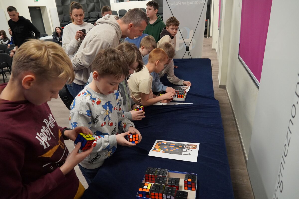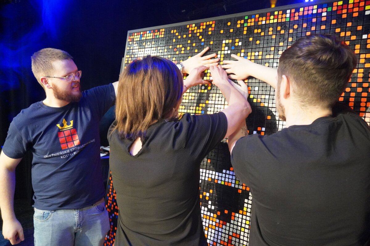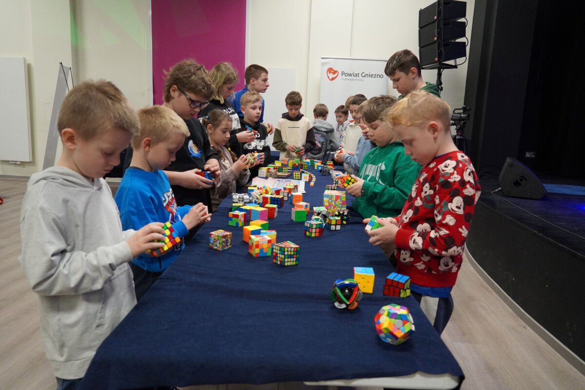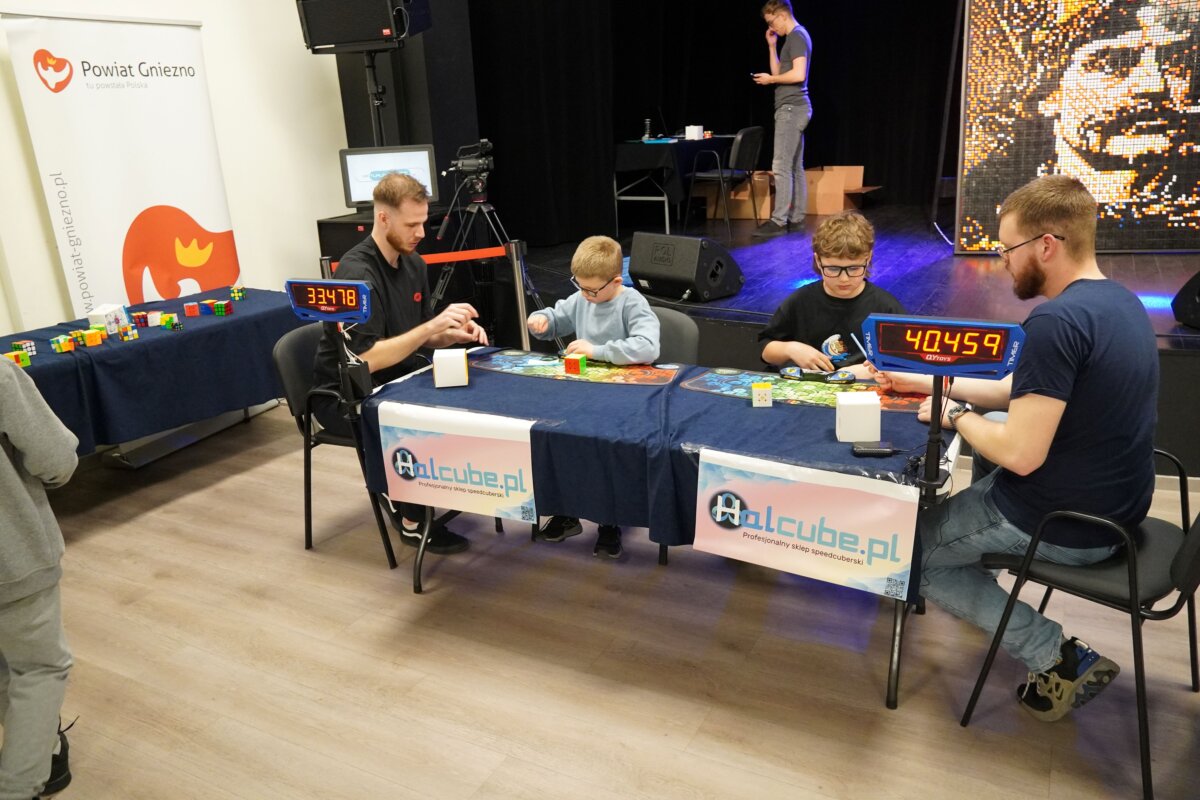 Układanie mozaiki z podobizną Bolesława Chrobrego wsparło też Starostwo Powiatowe i Starosta Powiatu Gnieźnieńskiego. – Wydarzenie pierwsze tego rodzaju w naszym powiecie, trafione w punkt. Ułożenie takiej mozaiki możemy określić jako wielki sukces. Udział szczególnie osób młodych przerósł nasze najśmielsze oczekiwania, co jest bardzo budujące. Czekamy już na następne tego rodzaju wydarzenia. Wielkie podziękowania dla Gnieźnieńskiego Stowarzyszenia Kostki Rubika za innowacyjność. Zapraszam wszystkich, dzieci i dorosłych do uczestnictwa w zajęciach z układania kostki prowadzonych w „eSTeDe” – powiedziała Ewa Barłoga – Purol z Zarządu Powiatu Gnieźnieńskiego. Jak długo trwa układanie mozaiki z tysiąca kostek? – Zaplanowaliśmy na to około czterech godzin. Zaangażowanych jest niezliczona liczba rąk. Cały czas przy układaniu mozaiki pracowały cztery osoby, a pomagało nam około 20 – 30 osób – informuje Robert Cegiel z Gnieźnieńskiego Stowarzyszenia Kostki Rubika. Powstawaniu portretu Bolesława Chrobrego towarzyszyły ponadto warsztaty nauki układania kostki Rubika, czy konkurs z nagrodami na jak najszybsze ułożenie klasycznej kostki 3×3. Trzech pierwszych zawodników otrzymało upominki ufundowane przez Starostę Powiatu Gnieźnieńskiego, które wręczyła Ewa Barłoga – Purol z Zarządu Powiatu Gnieźnieńskiego, a najlepsza ósemka finalistów okolicznościowe dyplomy.