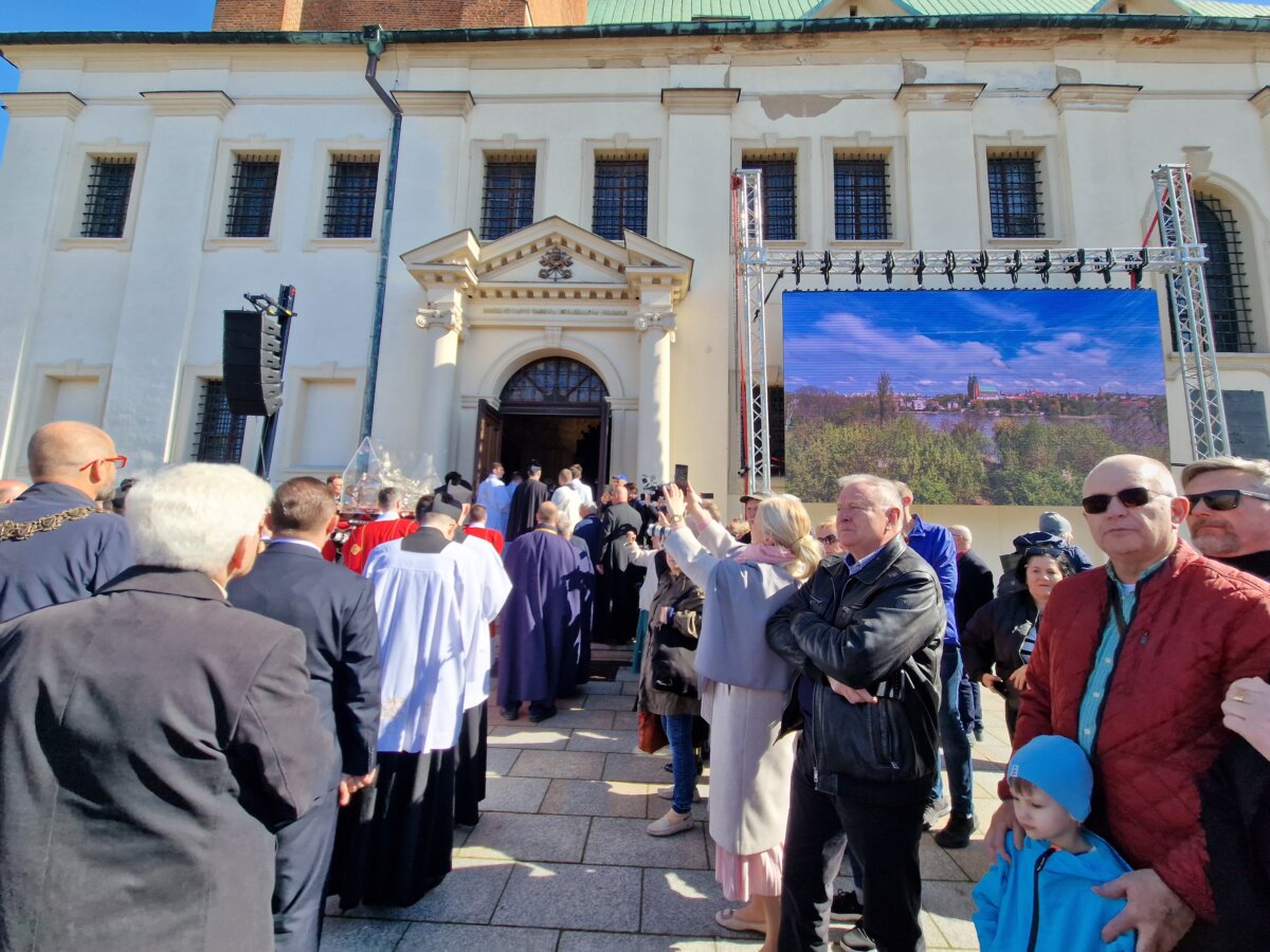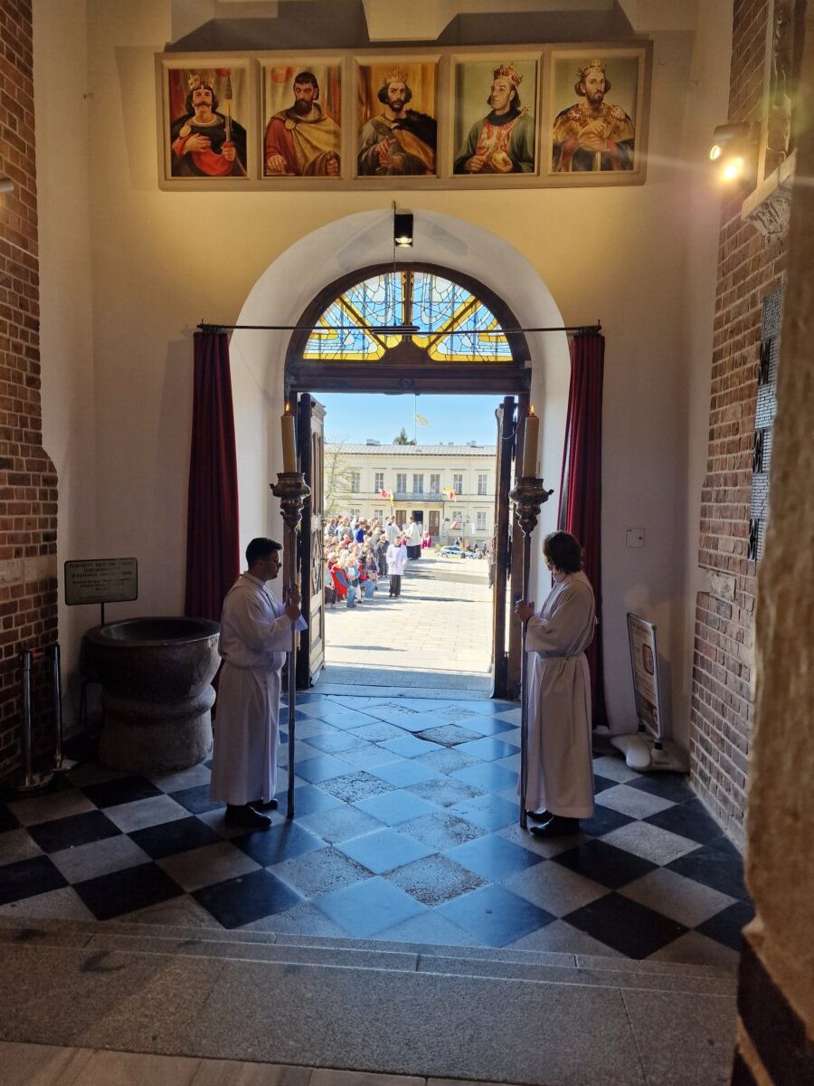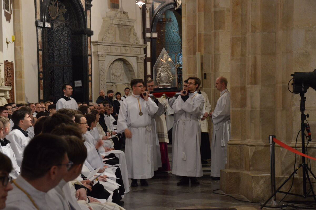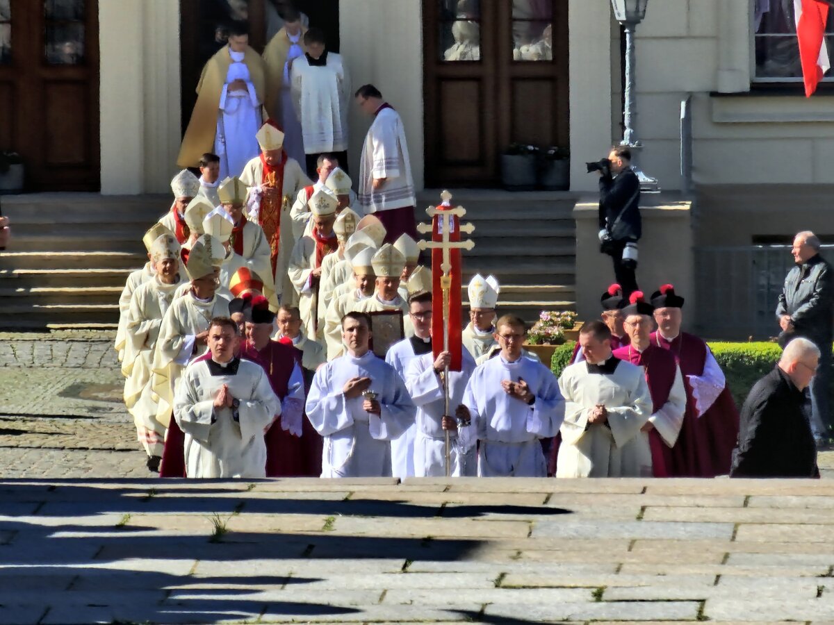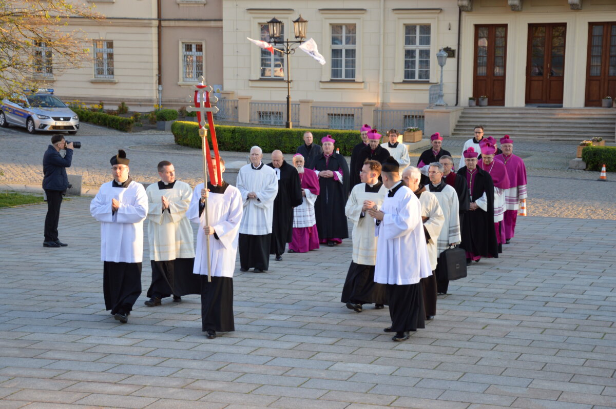 W niedzielę, 27 kwietnia o godzinie 9:15 uroczysta procesja z relikwiami wyruszyła ze Wzgórza Zbarskiego w kierunku katedry. W tym roku, ze względu na rocznicę koronacji królewskich, uroczysta msza święta odpustowa celebrowana była w bazylice prymasowskiej, a nie – jak zazwyczaj – na placu św. Wojciecha. W uroczystościach kościelnych uczestniczyli licznie zgromadzeni wierni, wśród nich: przedstawiciele duchowieństwa, przedstawiciele władz państwowych i samorządowych: wojewódzkich, powiatowych i miejskich, członkowie różnych organizacji, bractw i stowarzyszeń, przedstawiciele służb mundurowych, harcerze, pielgrzymi i in. Przybyłych do bazyliki prymasowskiej powitał abp Wojciech Polak. – Tegoroczne uroczystości świętowojciechowe od samego początku miały mieć szczególny charakter. Chcieliśmy bowiem, aby stały się okazją do naszego dziękczynienia za wiekopomne wydarzenie sprzed tysiąca lat, jakim była koronacja Bolesława Chrobrego, a następnie jego syna – Mieszka II Lamberta na królów Polski. Cieszę się, że po piątkowym posiedzeniu Sejmu i Senatu, w obecności Pana Prezydenta RP, które odbyło się w Gnieźnie, możemy teraz spotkać się w miejscu, w którym to wszystko się wydarzyło: w bazylice prymasowskiej, w auli koronacyjnej królów Polski. W te ogólnopolskie uroczystości chcieliśmy włączyć również naszą wdzięczność za 1025 lat istnienia archidiecezji gnieźnieńskiej, która została ustanowiona w czasie pamiętnego Zjazdu Gnieźnieńskiego – mówił Prymas Polski, w kolejnych słowach nawiązując także do śmierci papieża Franciszka. – Wydarzenia z ostatnich dni w naturalny sposób skłaniają nas do jeszcze jednej, niezwykle ważnej intencji, która towarzyszyć będzie naszej modlitwie. Chcemy przecież dziękować Panu Bogu za dar życia i pasterskiej posługi papieża Franciszka i jednocześnie prosić w ten dzień, za kościół święty, powierzając nas w opiece świętego Wojciecha i przyzywając Ducha Świętego, by prowadził w najbliższych dniach kolegium kardynałów – mówił abp Wojciech Polak na chwilę przed rozpoczęciem nabożeństwa.