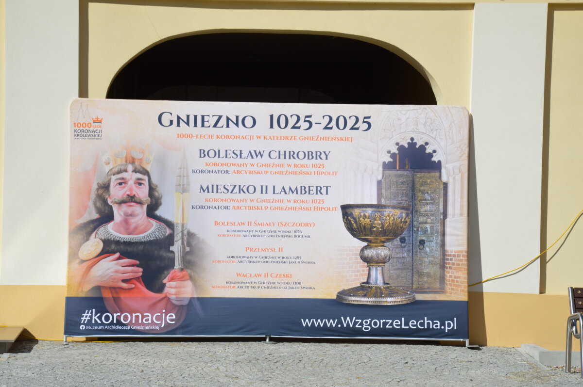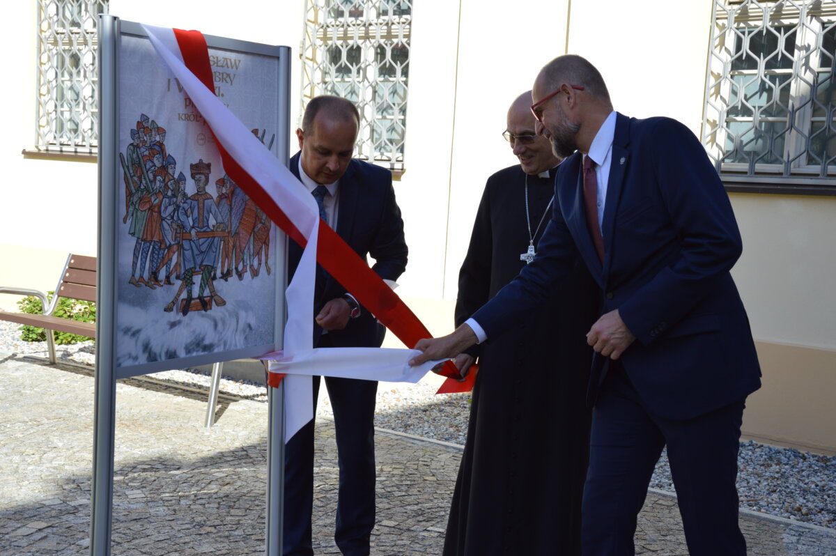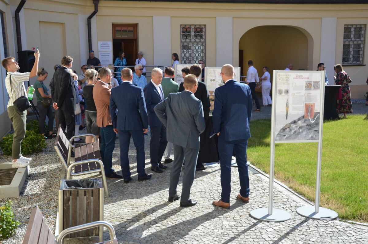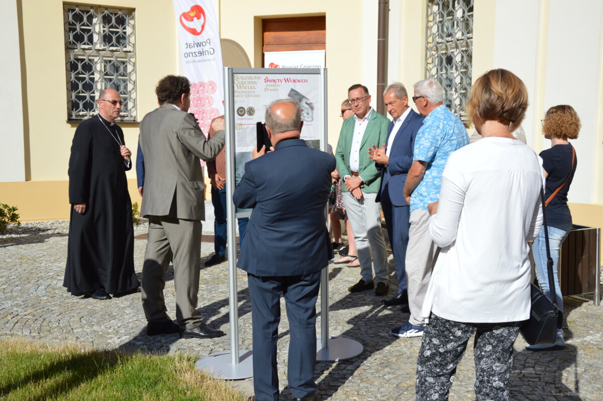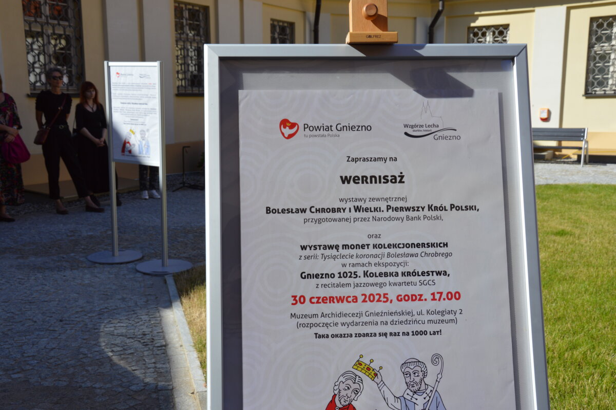 Wernisaż wystawy zewnętrznej, prezentowanej na dziedzińcu Muzeum Archidiecezji Gnieźnieńskiej, odbył się w poniedziałek, 30 czerwca. Symbolicznego otwarcia dokonali starosta Tomasz Budasz, dyrektor Bartosz Przybyła i abp Wojciech Polak. Prymas Polski podkreślał, że bardzo ważne jest umacnianie pamięci o przeszłości, by z nadzieją móc spoglądać w przyszłość. – Bardzo się cieszę, że w Gnieźnie, z okazji tych wielkich rocznic, nawiązała się swoista sztafeta. Kiedy obchodziliśmy 1050 – lecie chrztu Polski we współpracy z Narodowym Bankiem Polskim Archidiecezja Gnieźnieńska wydawała bardzo piękny banknot, który przedstawiał m.in. katedrę, miejsce chrztu Polski. I muszę powiedzieć, że ta współpraca była bardzo piękna. Teraz, z okazji 1000 – lecia koronacji Bolesława Chrobrego widzimy, że tę pałeczkę w sztafecie przejmuje Starostwo Powiatowe w Gnieźnie we współpracy z państwem i jednocześnie naszym muzeum, które pragnie właśnie w ten sposób, udostępniając swoje przestrzenie pokazywać to, co było dziedzictwem wielkiego geniuszu Bolesława Chrobrego, który w ten sposób bijąc monety nie tylko wpisywał się w poczet władców Europy, ale także pokazywał w ten sposób swoje imię i siebie jako władcę – mówił abp Wojciech Polak. – Nie byłoby narodzin królestwa polskiego, nie byłoby korony królewskiej na głowie Bolesława Chrobrego w Gnieźnie, gdyby wcześniej Mieszko I nie przyjął chrztu i gdyby Bolesław Chrobry nie przyjął ciała męczennika, świętego Wojciecha tu, w Gnieźnie, do którego w roku 1000 przybył cesarz Otton III. Stąd pierwsze uznanie Chrobrego, które miało miejsce za czasów Zjazdu Gnieźnieńskiego i cesarza Ottona III. Nawet Gall Anonim pisze o tym symbolicznym nałożeniu diademu cesarskiego na głowę Bolesława Chrobrego, które zostało potem zwieńczone prawdziwą koroną, którą otrzymał nasz władca w roku 1025. Jest to pewnego rodzaju sekwencja dziejów i myślę, że trzeba widzieć to wszystko jako wielki znak bożej opatrzności, który w ten sposób otrzymujemy po przeszło 1000 latach. Niech to spotkanie z historią nas umacnia i prowadzi ku przyszłości – podkreślał Prymas Polski.
