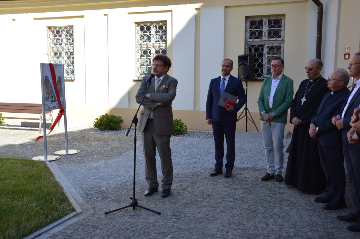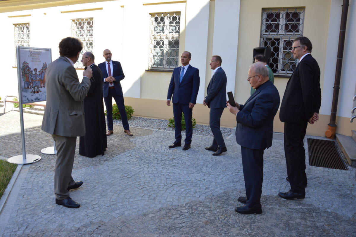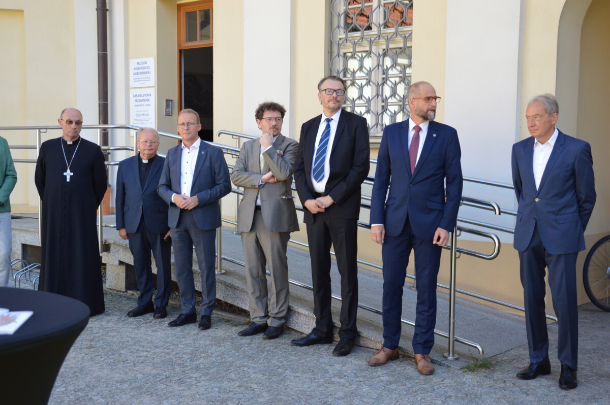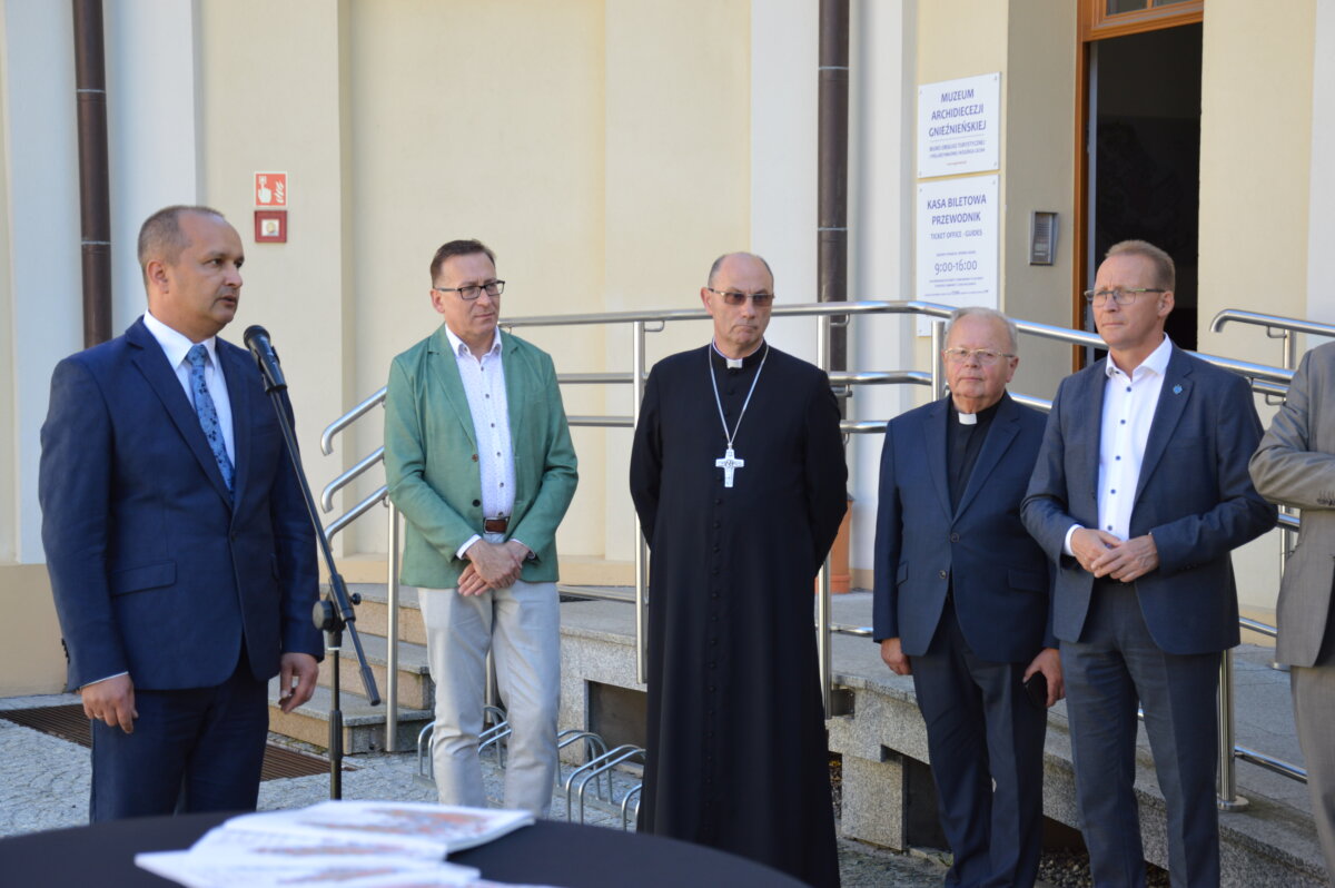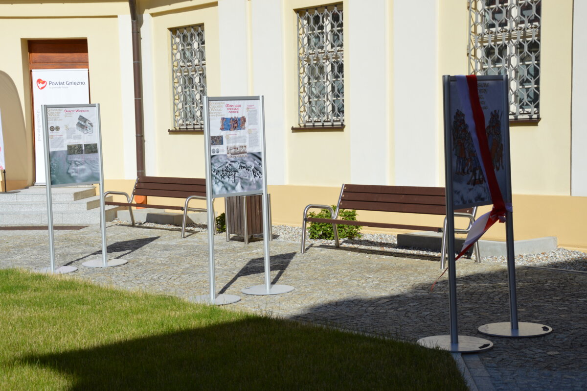 Wernisaż wystawy zewnętrznej, prezentowanej na dziedzińcu Muzeum Archidiecezji Gnieźnieńskiej, odbył się w poniedziałek, 30 czerwca. Symbolicznego otwarcia dokonali starosta Tomasz Budasz, dyrektor Bartosz Przybyła i abp Wojciech Polak. Prymas Polski podkreślał, że bardzo ważne jest umacnianie pamięci o przeszłości, by z nadzieją móc spoglądać w przyszłość. – Bardzo się cieszę, że w Gnieźnie, z okazji tych wielkich rocznic, nawiązała się swoista sztafeta. Kiedy obchodziliśmy 1050 – lecie chrztu Polski we współpracy z Narodowym Bankiem Polskim Archidiecezja Gnieźnieńska wydawała bardzo piękny banknot, który przedstawiał m.in. katedrę, miejsce chrztu Polski. I muszę powiedzieć, że ta współpraca była bardzo piękna. Teraz, z okazji 1000 – lecia koronacji Bolesława Chrobrego widzimy, że tę pałeczkę w sztafecie przejmuje Starostwo Powiatowe w Gnieźnie we współpracy z państwem i jednocześnie naszym muzeum, które pragnie właśnie w ten sposób, udostępniając swoje przestrzenie pokazywać to, co było dziedzictwem wielkiego geniuszu Bolesława Chrobrego, który w ten sposób bijąc monety nie tylko wpisywał się w poczet władców Europy, ale także pokazywał w ten sposób swoje imię i siebie jako władcę – mówił abp Wojciech Polak. – Nie byłoby narodzin królestwa polskiego, nie byłoby korony królewskiej na głowie Bolesława Chrobrego w Gnieźnie, gdyby wcześniej Mieszko I nie przyjął chrztu i gdyby Bolesław Chrobry nie przyjął ciała męczennika, świętego Wojciecha tu, w Gnieźnie, do którego w roku 1000 przybył cesarz Otton III. Stąd pierwsze uznanie Chrobrego, które miało miejsce za czasów Zjazdu Gnieźnieńskiego i cesarza Ottona III. Nawet Gall Anonim pisze o tym symbolicznym nałożeniu diademu cesarskiego na głowę Bolesława Chrobrego, które zostało potem zwieńczone prawdziwą koroną, którą otrzymał nasz władca w roku 1025. Jest to pewnego rodzaju sekwencja dziejów i myślę, że trzeba widzieć to wszystko jako wielki znak bożej opatrzności, który w ten sposób otrzymujemy po przeszło 1000 latach. Niech to spotkanie z historią nas umacnia i prowadzi ku przyszłości – podkreślał Prymas Polski.