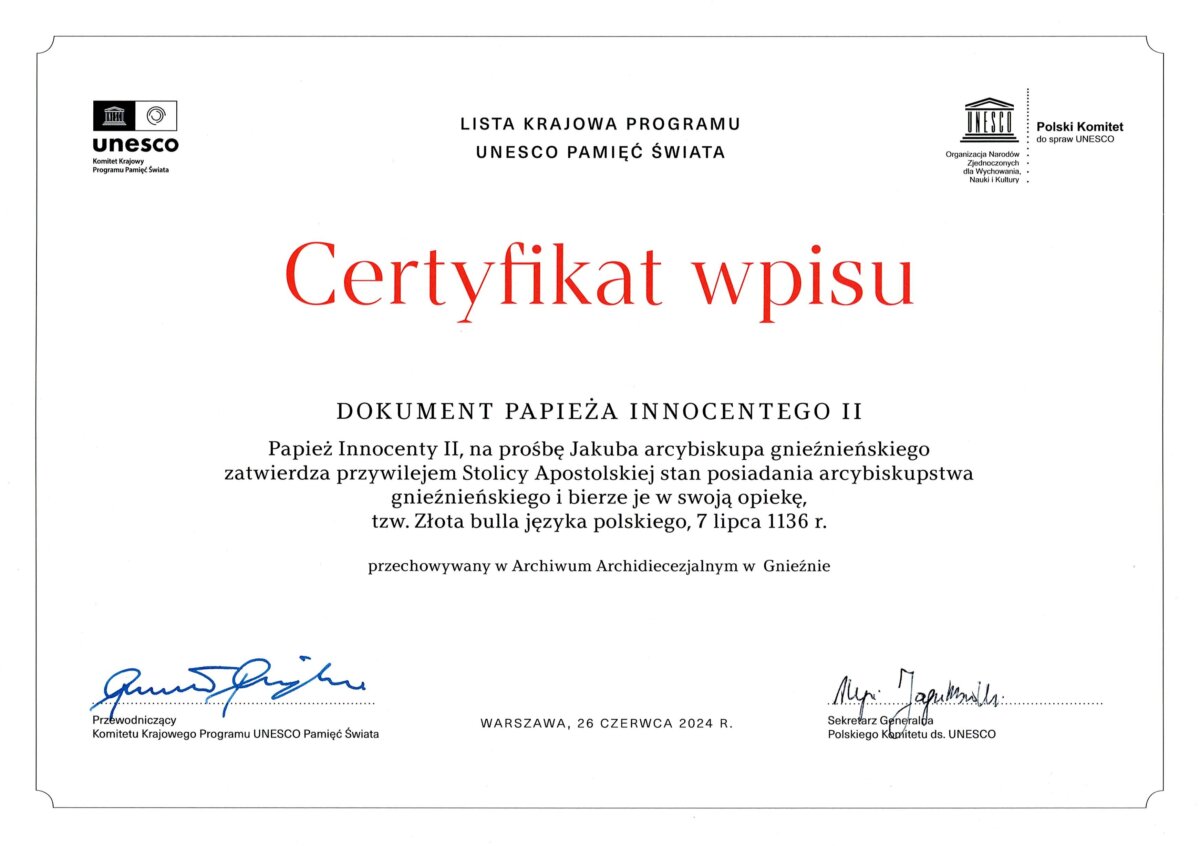 Dokument protekcyjny papieża Innocentego II z 1136 roku dla arcybiskupstwa gnieźnieńskiego, przechowywany w Archiwum Archidiecezjalnym w Gnieźnie, został wpisany na listę krajową programu UNESCO „Pamięć świata”. Decyzję o wpisie podjął Polski Komitet ds. UNESCO.
