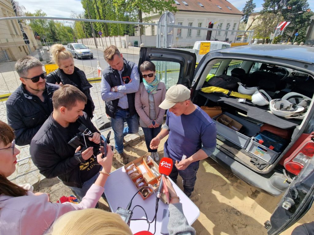 Po placu prac archeologicznych oprowadził dziennikarzy Damian Ozimek, archeolog nadzorujący prace. – Tutaj widzimy fundamenty murowanego budynku z XIX wieku, a zaraz obok znajduje się pochówek ludzki, prawdopodobnie z XVIII wieku. Odsłoniliśmy także relikty ziemno-drewnianego wału drugiego podgrodzia z okresu XI wieku. Tutaj drewno się już nie zachowało i jest przemieszane z piaskiem. Idąc w górę ulicy odkryliśmy relikty chaty. Datowana ona jest na drugą połowę XI wieku – relacjonuje postępy prac archeolog. Z ziemi wyłaniają się drobne przedmioty, np. fragmenty ceramiki, kości zwierzęcych, skóry. Odkryto także studnię, która obecnie jest eksplorowana. Znajduje się w niej obiecujący materiał, np. kafle z XV wieku. – Mamy na kaflu przedstawienie biblijne. Jest to Jonasz z wielorybem – prezentuje ceramikę D. Ozimek. Archeolodzy podjęli już decyzje i złożyli wniosek o poszerzenie zakresu prac, by odkryć więcej obiecujących historycznie miejsc.