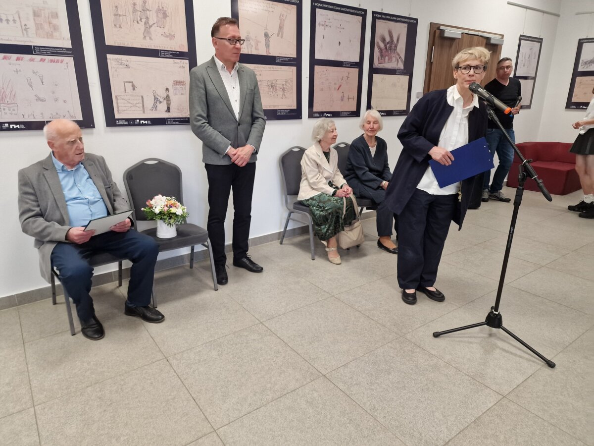 Jedna z prac zaprezentowanych na wystawie jest autorstwa pani Stefanii Smolenko. Autorka po 79 latach od jej narysowania ponownie ją zobaczyła. „Gehenna ludu polskiego, od roku 1939 do roku 1945” przedstawia sielskie okoliczności (kościół w oddali, drzewa) ale na pierwszym planie widoczne są dwie związane postacie do których celują niemieccy żołnierze. Jak przyznaje autorka, przedstawionej sceny sama nie widziała, ale znała takie historie z opowiadań. – Bałam się bardzo – wspomina czas wojenny pani Stefania. – Bałam się ciemności. Okna były pozakrywane ciemnymi roletami. Pamiętam odgłosy przelatujących bombowców. Kiedy zaczęła się wojna, miałam 9 lat i moja edukacja została przerwana – wspomina dziś. Jak dopowiada siostra pani Stefanii – Anna, obie siostry pamiętają płonąca katedrę. – Nie powinno być wojny. Że mogła ona wybuchnąć na Ukrainie, to jest nie do pojęcia. Po tylu latach spokoju rosyjska agresja jest przerażająca. Ludzie cierpią tak, jak za naszych czasów. Dla mnie czas wojny był czasem straconym dla rozwoju i nauki. 5,5 roku nie było szkoły. Rok dzieci chodziły przymusowo do niemieckiej szkoły, potem był w budynku szpital dla niemieckich żołnierzy. Niektórzy chodzili na tajne nauczanie, a do nas przychodził organista, który uczył grać na fortepianie siostrę i dwóch starszych braci. Straciłyśmy całe lata – wspomina z żalem Anna Smolenko.
