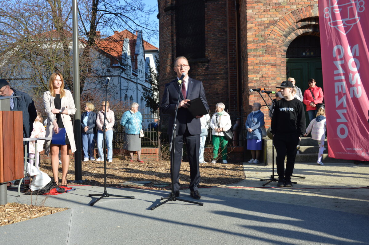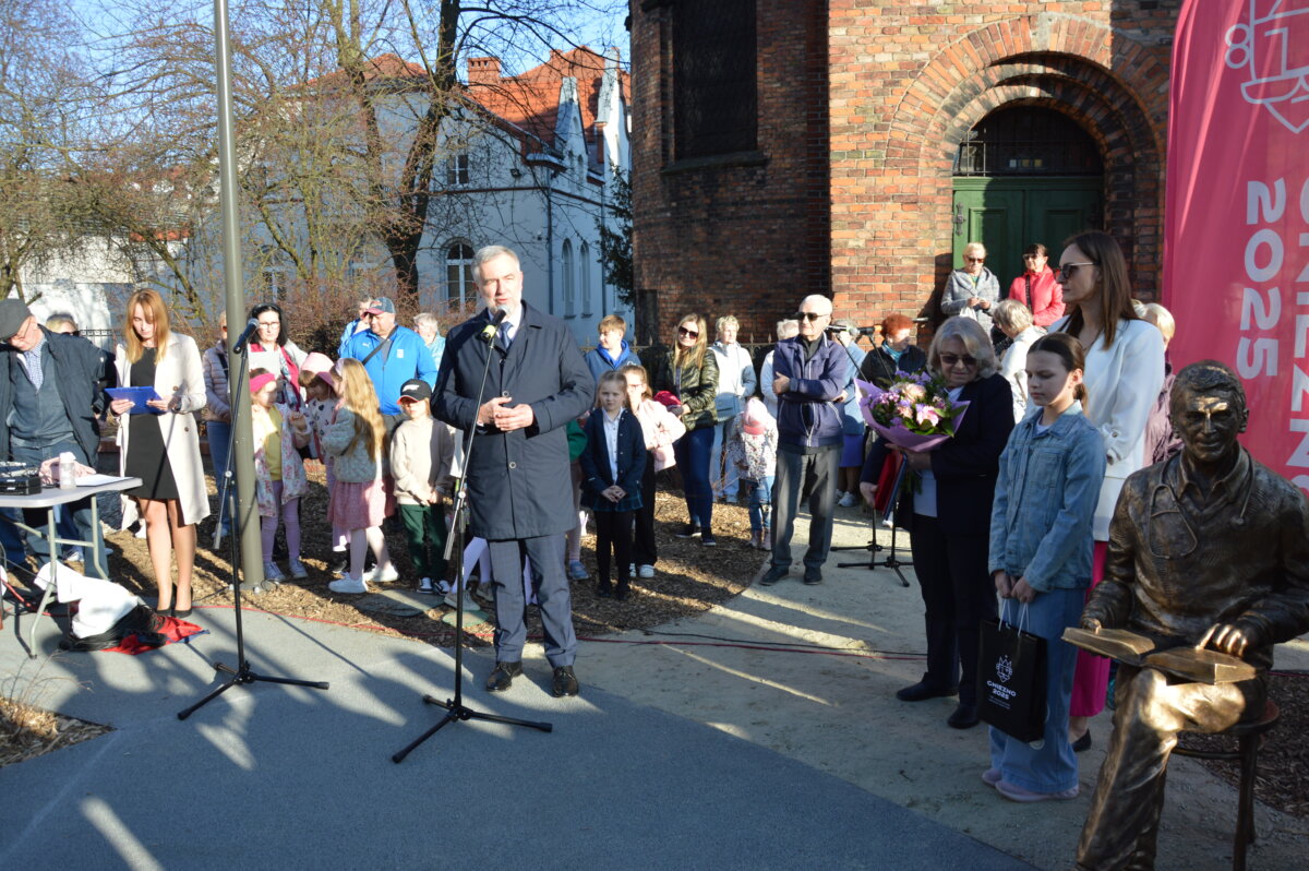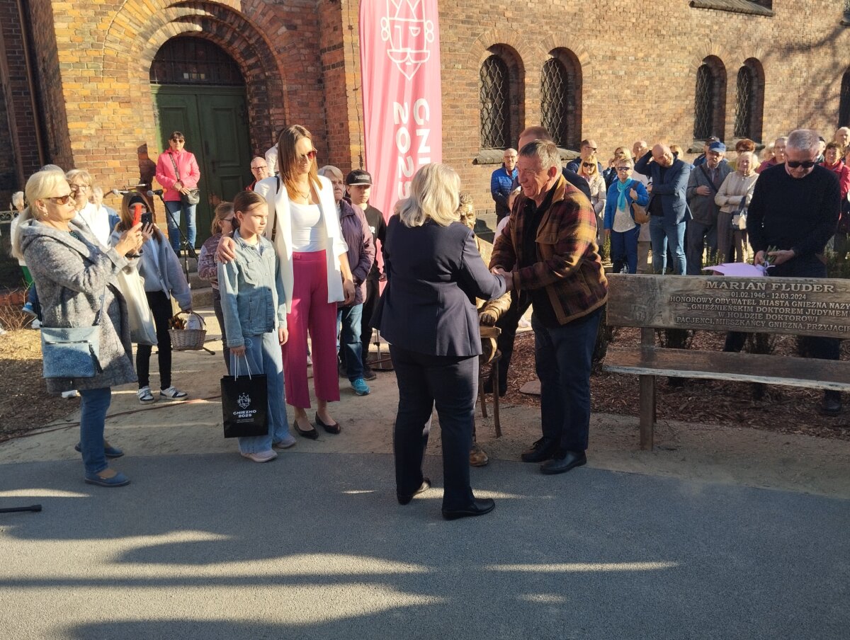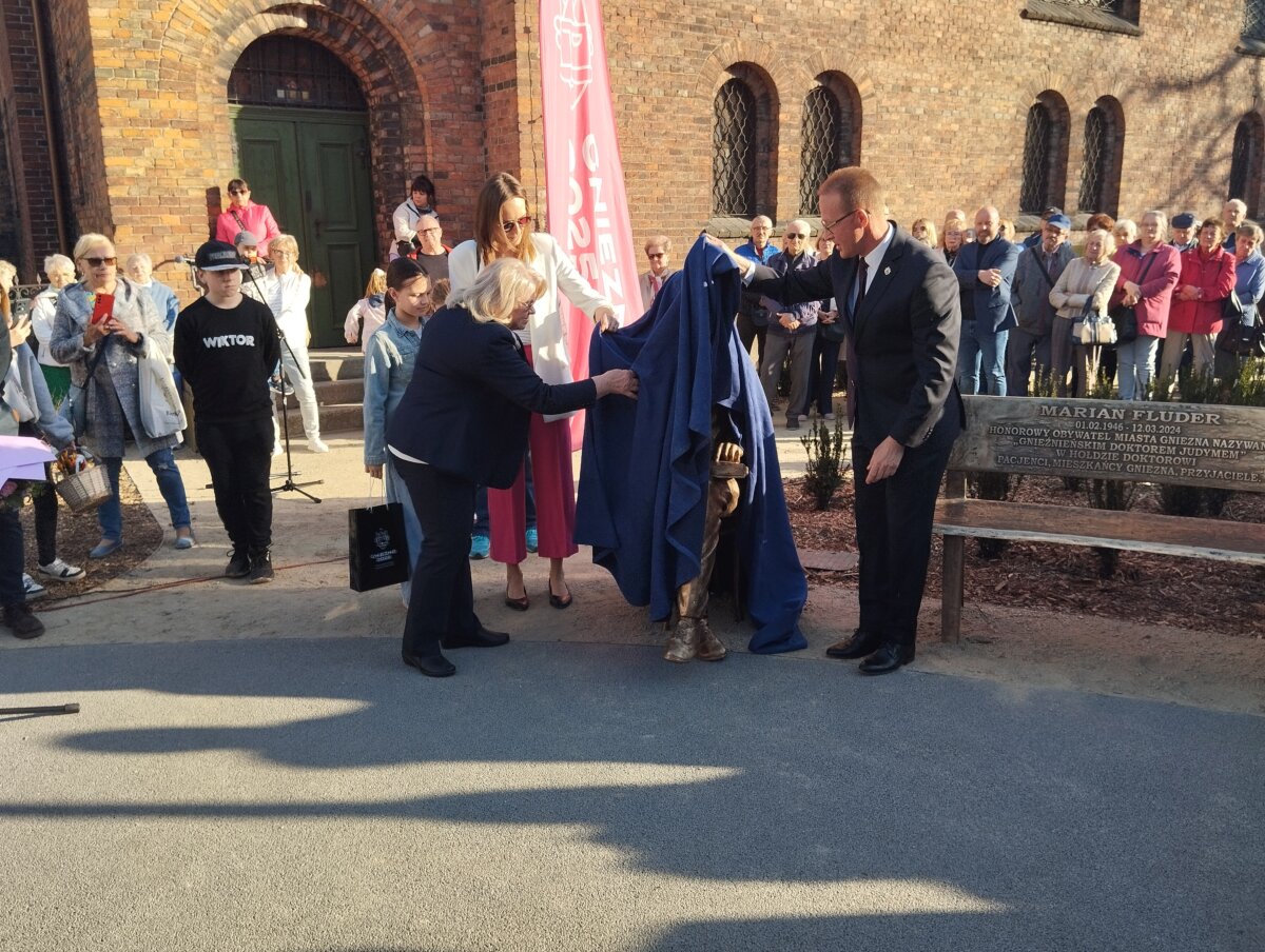 Oficjalne odsłonięcie miejsca pamięci i oddanie do użytku zrewitalizowanego skweru nastąpiło w piątek, 28 marca. Tego dnia już od godzin południowych na skwerze prowadzona była akcja profilaktyczna, przygotowana przez Akademię Nauk Stosowanych i Wielkopolskie Samorządowe Centrum Kształcenia Zawodowego i Ustawicznego. Punktualnie o godzinie 16. nastąpiła ceremonia odsłonięcia pomnika, która zgromadziła wielu gnieźnian i mieszkańców powiatu gnieźnieńskiego: członków rodziny, przyjaciół i pacjentów. Na początku uroczystości głos zabrał prezydent Michał Powałowski, który przywitał wszystkich przybyłych i w krótkim przemówieniu wspomniał postać doktora, podkreślając jego niezwykłe zaangażowanie i determinację w służbie drugiemu człowiekowi. Następnie dokonano odsłonięcia rzeźby, którego wspólnie z prezydentem dokonały Zofia Fluder – wdowa po doktorze i Aleksandra Szeszycka – inicjatorka powstania miejsca pamięci. – Dzisiaj nasza rodzina przepełniona jest wzruszeniem i wdzięcznością, stojąc wśród was, by wspólnie uhonorować bliską nam osobę wyjątkowego lekarza, jakim był mój mąż, Marian Fluder. Nadanie temu skwerowi jego nazwiska oraz odsłonięcie ławeczki to nie tylko piękny gest, ale przede wszystkim dowód na to, jak wiele znaczył dla naszej społeczności. Maryś zawsze powtarzał, że bycie lekarzem to nie tylko zawód, ale prawdziwe powołanie. Przez ponad pięćdziesiąt lat służył mieszkańcom Gniezna, przede wszystkim jako pediatra. Jego pracowitość, troska o pacjentów i niezwykła empatia sprawiły, że zyskał miano gnieźnieńskiego „doktora Judyma”. Każdego dnia kierował się zasadą, że dobro pacjenta jest najważniejsze, niezależnie od czasu, sił oraz potrzeb własnych. Możemy z pełną odpowiedzialnością stwierdzić, że pacjent był dla niego zawsze na pierwszym miejscu, a ukochana medycyna najciekawszą dziedziną nauki – mówiła wdowa po doktorze. – Dzięki waszym wspomnieniom i inicjatywie ten skwer staje się nie tylko miejscem pamięci, ale także symbolem wartości, które mąż reprezentował: empatii, poświęcenia, niesienia pomocy drugiemu człowiekowi. Wierzymy, że każdy, kto tu usiądzie, choć na chwilę zatrzyma się w biegu codzienności i przypomni sobie, jak ważne jest dobro i życzliwość wobec innych. (…) Wierzymy, że dzisiaj [Marian Fluder – dop. red.] patrzy na nas z góry, dumny widząc, jak wielu ludzi o nim pamięta. Dziękujemy, że jesteście z nami – podkreślała Zofia Fluder, szczególne słowa podziękowania kierując w stronę przedstawicieli władz Miasta Gniezna i Aleksandry Szeszyckiej.