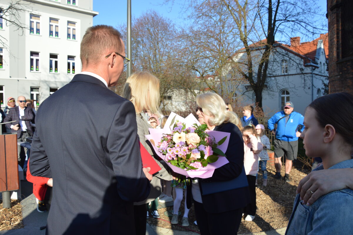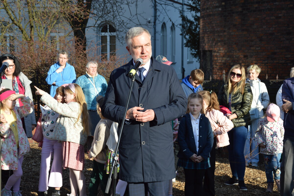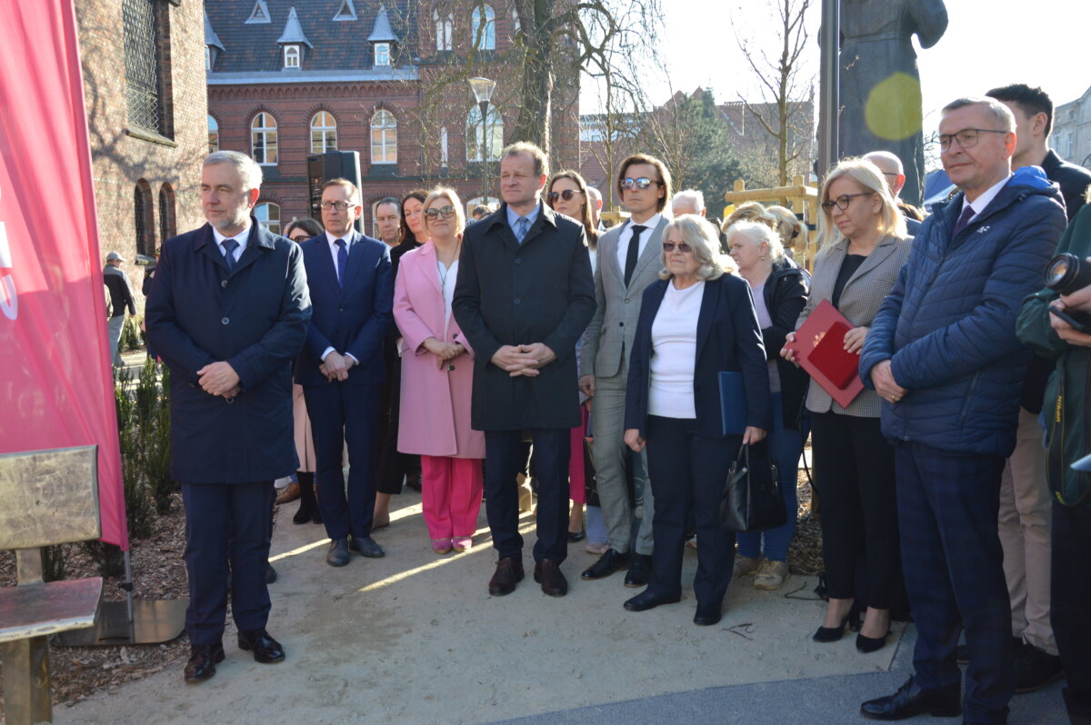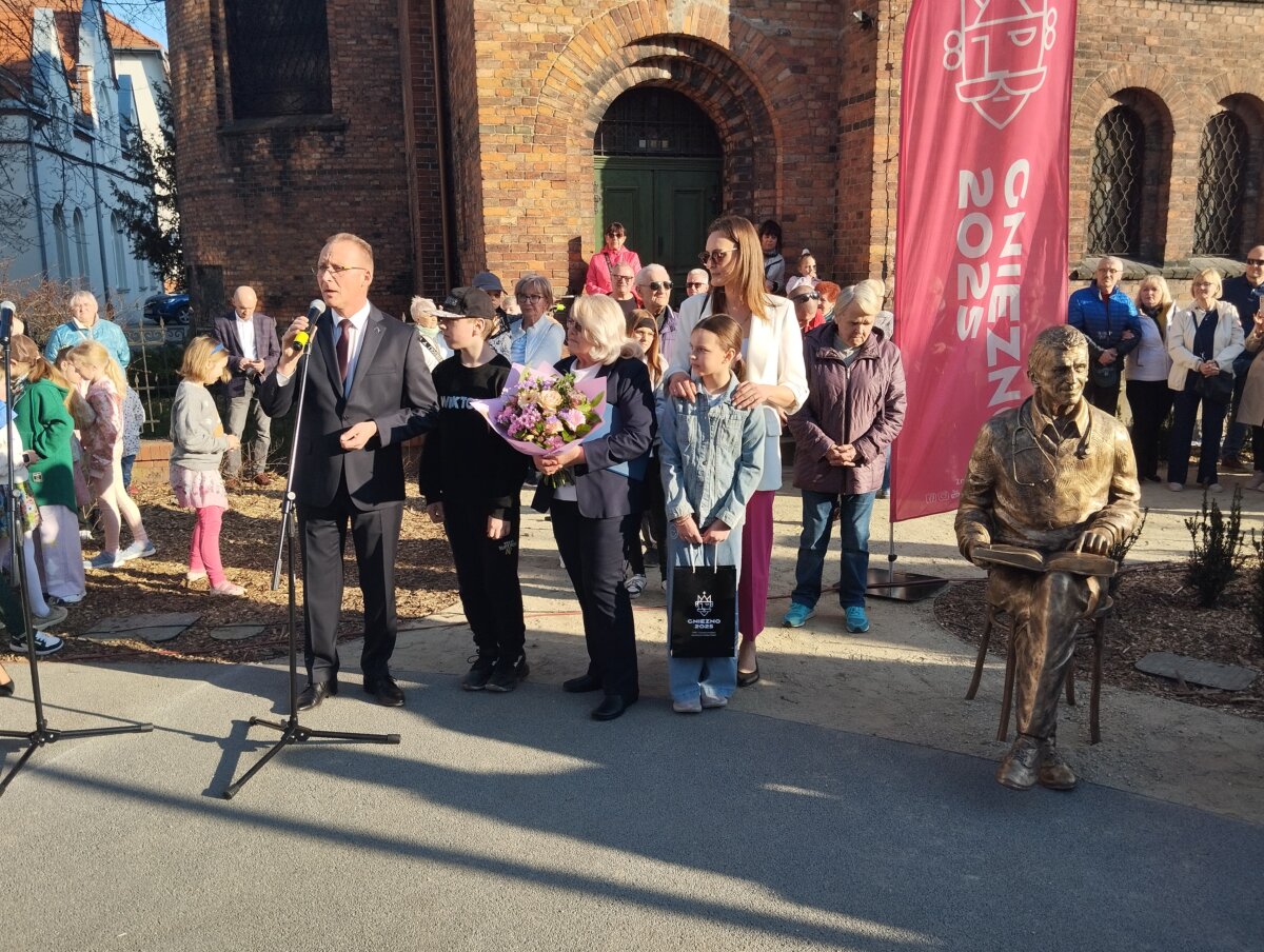 Oficjalne odsłonięcie miejsca pamięci i oddanie do użytku zrewitalizowanego skweru nastąpiło w piątek, 28 marca. Tego dnia już od godzin południowych na skwerze prowadzona była akcja profilaktyczna, przygotowana przez Akademię Nauk Stosowanych i Wielkopolskie Samorządowe Centrum Kształcenia Zawodowego i Ustawicznego. Punktualnie o godzinie 16. nastąpiła ceremonia odsłonięcia pomnika, która zgromadziła wielu gnieźnian i mieszkańców powiatu gnieźnieńskiego: członków rodziny, przyjaciół i pacjentów. Na początku uroczystości głos zabrał prezydent Michał Powałowski, który przywitał wszystkich przybyłych i w krótkim przemówieniu wspomniał postać doktora, podkreślając jego niezwykłe zaangażowanie i determinację w służbie drugiemu człowiekowi. Następnie dokonano odsłonięcia rzeźby, którego wspólnie z prezydentem dokonały Zofia Fluder – wdowa po doktorze i Aleksandra Szeszycka – inicjatorka powstania miejsca pamięci. – Dzisiaj nasza rodzina przepełniona jest wzruszeniem i wdzięcznością, stojąc wśród was, by wspólnie uhonorować bliską nam osobę wyjątkowego lekarza, jakim był mój mąż, Marian Fluder. Nadanie temu skwerowi jego nazwiska oraz odsłonięcie ławeczki to nie tylko piękny gest, ale przede wszystkim dowód na to, jak wiele znaczył dla naszej społeczności. Maryś zawsze powtarzał, że bycie lekarzem to nie tylko zawód, ale prawdziwe powołanie. Przez ponad pięćdziesiąt lat służył mieszkańcom Gniezna, przede wszystkim jako pediatra. Jego pracowitość, troska o pacjentów i niezwykła empatia sprawiły, że zyskał miano gnieźnieńskiego „doktora Judyma”. Każdego dnia kierował się zasadą, że dobro pacjenta jest najważniejsze, niezależnie od czasu, sił oraz potrzeb własnych. Możemy z pełną odpowiedzialnością stwierdzić, że pacjent był dla niego zawsze na pierwszym miejscu, a ukochana medycyna najciekawszą dziedziną nauki – mówiła wdowa po doktorze. – Dzięki waszym wspomnieniom i inicjatywie ten skwer staje się nie tylko miejscem pamięci, ale także symbolem wartości, które mąż reprezentował: empatii, poświęcenia, niesienia pomocy drugiemu człowiekowi. Wierzymy, że każdy, kto tu usiądzie, choć na chwilę zatrzyma się w biegu codzienności i przypomni sobie, jak ważne jest dobro i życzliwość wobec innych. (…) Wierzymy, że dzisiaj [Marian Fluder – dop. red.] patrzy na nas z góry, dumny widząc, jak wielu ludzi o nim pamięta. Dziękujemy, że jesteście z nami – podkreślała Zofia Fluder, szczególne słowa podziękowania kierując w stronę przedstawicieli władz Miasta Gniezna i Aleksandry Szeszyckiej.
