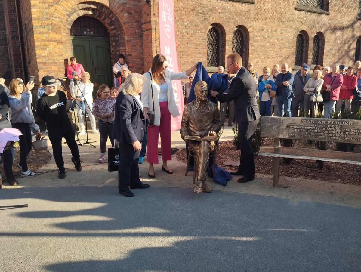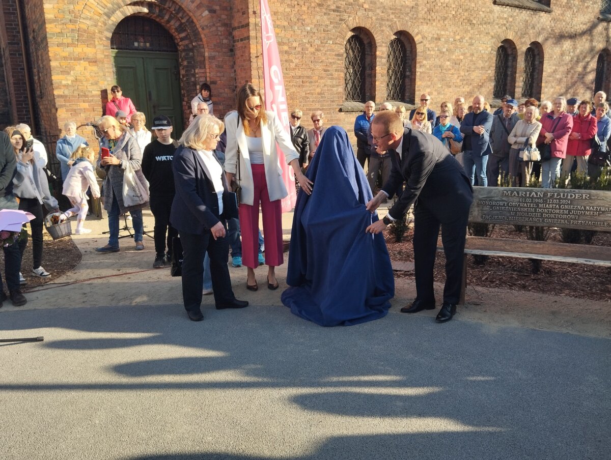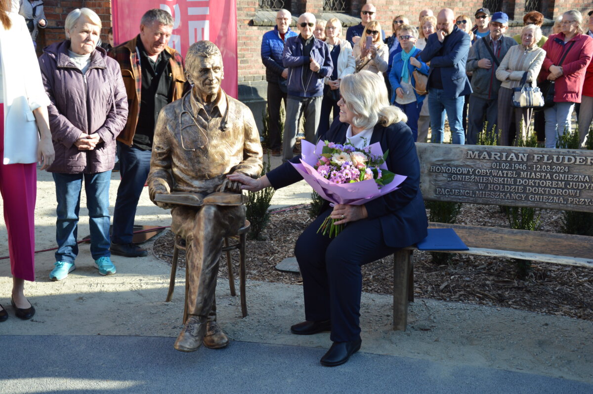 Doktor Marian Fluder zmarł 12 marca 2024 roku. Odszedł człowiek, który na zawsze pozostanie w sercach i pamięci setek, a może i tysięcy osób, którym uratował zdrowie i życie. Jego zaangażowanie w pomoc innym oraz empatia sprawiły, że stał się symbolem dobra i wzorem lekarza. Pozostawił po sobie pustkę w sercach wielu ludzi, dlatego też bardzo szybko po jego śmierci pojawił się pomysł, by w Gnieźnie powstało miejsce pamięci poświęcone zasłużonemu lekarzowi – ławeczka jego imienia. Ruszyła zbiórka pieniędzy na ten cel – oddolna inicjatywa, której główną inicjatorką była Aleksandra Szeszycka, wdzięczna pacjentka doktora. W sumie udało się zebrać 75 185,00 zł. Resztę brakujących środków dołożył samorząd Miasta Gniezna. – Dla wszystkich gnieźnian doktor Marian Fluder był niezwykłą postacią. Był to człowiek, który o każdej porze dnia i nocy był gotowy służyć drugiej osobie. Dla niego pacjent był najważniejszy, nie potrafił przejść obojętnie obok człowieka, któremu doskwierało jakieś cierpienie. Na pewno był naszym gnieźnieńskim, współczesnym doktorem Judymem. Nie liczył swojego czasu, nie patrzył w kalendarz, zawsze był gotowy i był tutaj z nami. Dlatego też, kiedy po jego śmierci powstała inicjatywa społeczna, aby upamiętnić jego postać na skwerze w postaci pomnika, tzw. ławeczki doktora Mariana Fludra, dzięki pani Aleksandrze Szeszyckiej, która podjęła tę rękawicę i zaangażowała się z pełną determinacją w zbiórkę społeczną, to my też, jako samorząd, nie mogliśmy nie odpowiedzieć na to i wesprzeć tę inicjatywę – podkreśla Michał Powałowski, prezydent Gniezna. Miejsce pamięci to nie jedyny ukłon w stronę zasłużonego doktora. Decyzją Rady Miasta Gniezna rewitalizowanemu w centrum Gniezna miejscu u zbiegu ulic Łubieńskiego i Chrobrego nadano nazwę Skweru im. dra Mariana Fludra, Honorowego Obywatela Miasta Gniezna. Tam też, w samym centrum usytuowane zostało miejsce pamięci doktora: ławeczka i pomnik – rzeźba przedstawiająca sylwetkę gnieźnieńskiego „doktora Judyma”.