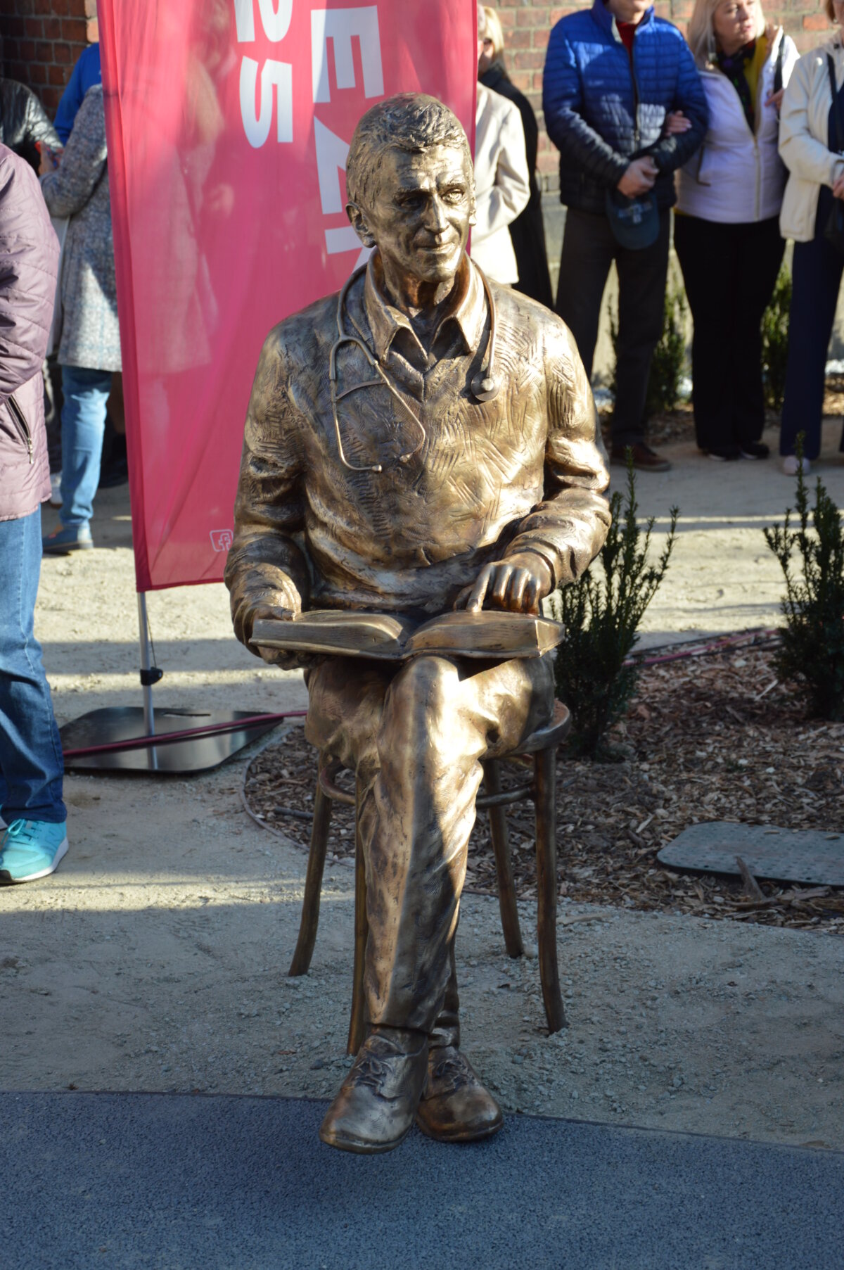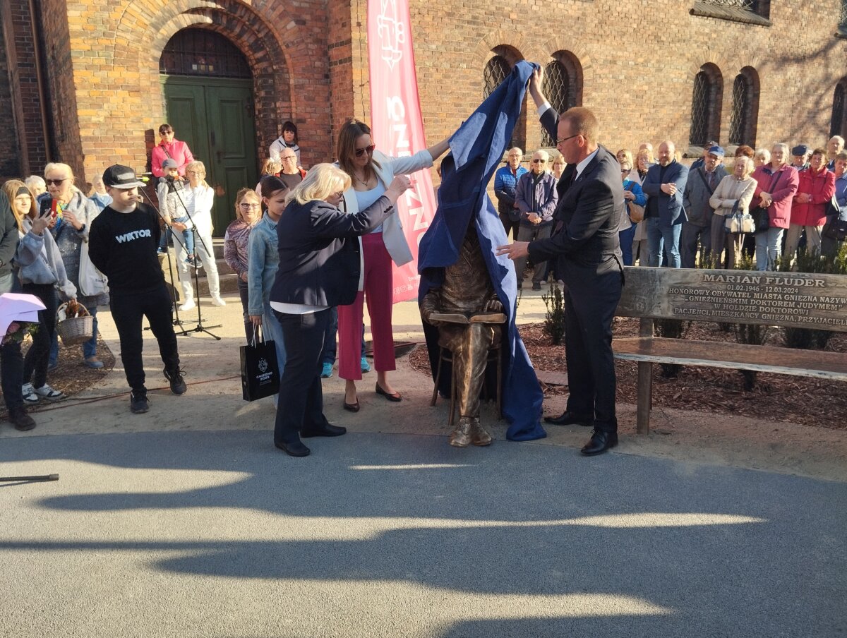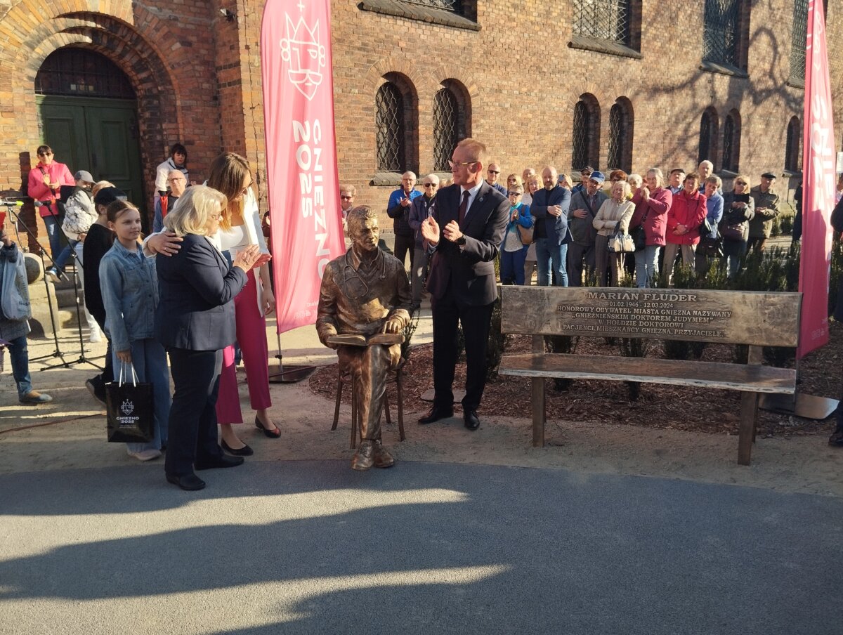 Doktor Marian Fluder zmarł 12 marca 2024 roku. Odszedł człowiek, który na zawsze pozostanie w sercach i pamięci setek, a może i tysięcy osób, którym uratował zdrowie i życie. Jego zaangażowanie w pomoc innym oraz empatia sprawiły, że stał się symbolem dobra i wzorem lekarza. Pozostawił po sobie pustkę w sercach wielu ludzi, dlatego też bardzo szybko po jego śmierci pojawił się pomysł, by w Gnieźnie powstało miejsce pamięci poświęcone zasłużonemu lekarzowi – ławeczka jego imienia. Ruszyła zbiórka pieniędzy na ten cel – oddolna inicjatywa, której główną inicjatorką była Aleksandra Szeszycka, wdzięczna pacjentka doktora. W sumie udało się zebrać 75 185,00 zł. Resztę brakujących środków dołożył samorząd Miasta Gniezna. – Dla wszystkich gnieźnian doktor Marian Fluder był niezwykłą postacią. Był to człowiek, który o każdej porze dnia i nocy był gotowy służyć drugiej osobie. Dla niego pacjent był najważniejszy, nie potrafił przejść obojętnie obok człowieka, któremu doskwierało jakieś cierpienie. Na pewno był naszym gnieźnieńskim, współczesnym doktorem Judymem. Nie liczył swojego czasu, nie patrzył w kalendarz, zawsze był gotowy i był tutaj z nami. Dlatego też, kiedy po jego śmierci powstała inicjatywa społeczna, aby upamiętnić jego postać na skwerze w postaci pomnika, tzw. ławeczki doktora Mariana Fludra, dzięki pani Aleksandrze Szeszyckiej, która podjęła tę rękawicę i zaangażowała się z pełną determinacją w zbiórkę społeczną, to my też, jako samorząd, nie mogliśmy nie odpowiedzieć na to i wesprzeć tę inicjatywę – podkreśla Michał Powałowski, prezydent Gniezna. Miejsce pamięci to nie jedyny ukłon w stronę zasłużonego doktora. Decyzją Rady Miasta Gniezna rewitalizowanemu w centrum Gniezna miejscu u zbiegu ulic Łubieńskiego i Chrobrego nadano nazwę Skweru im. dra Mariana Fludra, Honorowego Obywatela Miasta Gniezna. Tam też, w samym centrum usytuowane zostało miejsce pamięci doktora: ławeczka i pomnik – rzeźba przedstawiająca sylwetkę gnieźnieńskiego „doktora Judyma”.