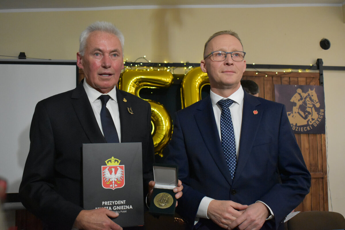 Historia Dragona to historia jeździectwa w ogóle. Początkowo nawet nie stosowano w tym urazowym sporcie ochrony głowy. Po zmianie przepisów Dragoni stosowali kaski hokejowe, potem potrzebne były specjalne toczki. – Prezes Baranowski „załatwiał” te toczki, które kosztowały ze 100 złotych. Ale Grzegorz dowiedział się, że mają je w „geesach”. Zadzwonił i mu powiedzieli, że mają, ale po 260 złotych. Spytał zatem, dlaczego tak drogo. Odpowiedzieli mu, że dlatego, bo są na gumowych kołach – przytaczał kolejną anegdotę prezes klubu. W końcu przez pół wieku takich zdarzeń uzbierało się mnóstwo i raz po razie je sobie przypominano. Początkowo jazdy trwały 1,5 godziny, łącznie z oporządzeniem i wyczyszczeniem konia. – Spotykaliśmy się w „Europejskiej” i zafascynowani opowiadaliśmy sobie, jak wyglądała ostatnia jazda. Niektórzy opowiadali po 3 godziny coś, co trwało ledwie połowę tego czasu – śmiał się prezes na wspomnienie tamtych pionierskich lat. Zajęcia z adeptami jeździectwa prowadzili m.in. Zygmunt Szymoniak, Andrzej Matławski, Kazimierz Goska, Kazimierz Szymoniak, Edmund Kruk. – Reprezentowali oni twardą szkołę jazdy – pamięta W. Olejniczak. Sekcja organizowała swoje wewnętrzne mistrzostwa, zarówno halowe jak i otwarte. „Hubertusy” organizowane w Gnieźnie przez Dragona były podziwiane przez odwiedzających je ministrów. Były zawsze najlepsze w Polsce. Jak podsumował obecny prezes klubu – mimo rywalizacji, Dragoni zawsze byli grupą przyjaciół i tak pozostaje. Piękny jubileusz stał się dobrą okazją do wręczenia odznaczeń. Minister Sportu odznaczył Włodzimierza Olejniczaka brązową odznaką za zasługi dla sportu, którą przekazała prezesowi Paulina Hennig-Kloska, minister klimatu i środowiska. Michał Powałowski, prezydent miasta, Medalem Królewskim również uhonorował prezesa klubu, a także Medalami Gnieźnieńskimi Tadeusza Nitkę, Andrzeja Matławskiego, Genowefę Perlak, Jana Dudczaka i Andrzeja Bryjaka. Tomasz Budasz, starosta gnieźnieński odznaczył Zestawem Koronacyjnym wydanym z okazji 1000-lecia Koronacji Jarosława Szymoniaka oraz specjalnymi podziękowaniami za działalność na rzecz klubu: Jerzego Kaczorowskiego, Renatę Nawrocką, Marka Kałużniaka oraz Błażeja Woźniaka. Odznaczenia Ludowych Zespołów Sportowych, które wręczyli poseł Tadeusz Tomaszewski i Stanisław Dolaciński, powędrowały do – brązowa odznaka: Grzegorza Krupy, Ireneusza Lisiewicza, Błażeja Woźniaka, Pauliny Kaczmarek, Genowefy Perlak i Renaty Nawrockiej; srebrna odznaka do Bogusława Kowalskiego oraz odznaczenia LZS województwa wielkopolskiego do Jana Dudczaka i Jarosława Szymoniaka.