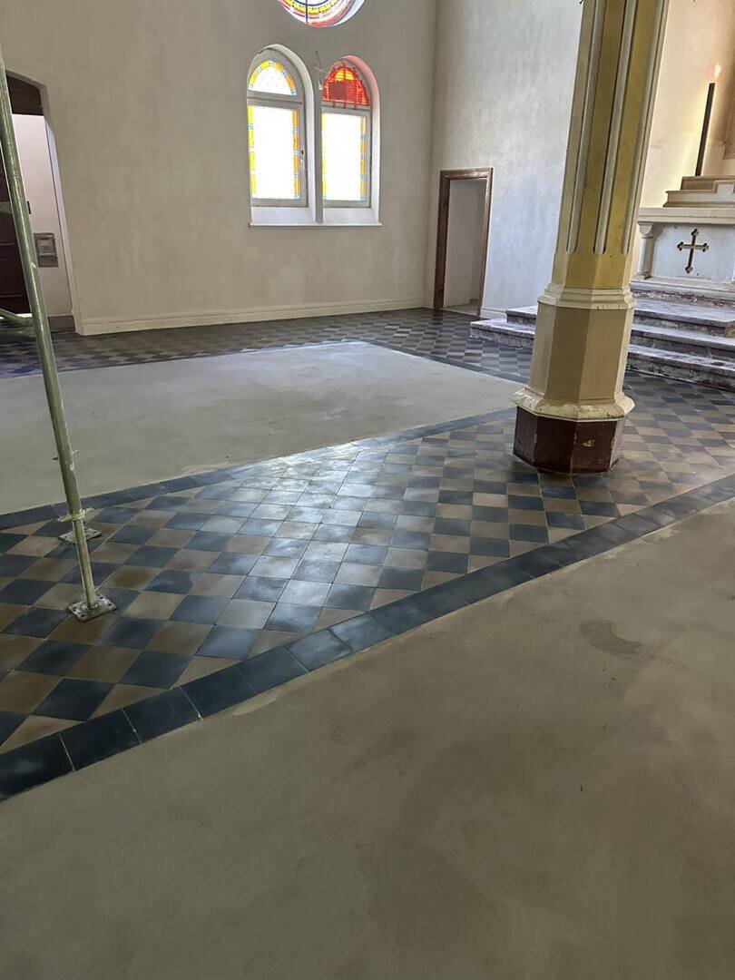 W ramach projektu wykonano roboty dotyczące posadzki, m.in. prace konserwatorskie związane z myciem, izolacją poziomą z folii i płyt styropianowych, wylanie betonu warstwy wyrównawczej i ułożenie posadzki o łącznej powierzchnia posadzki: 81,4 m2.