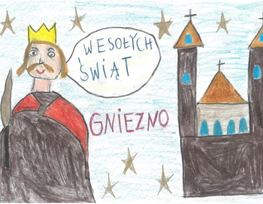 Pierwsze miejsce zdobył rysunek Łucji Bartoszak z drugiej klasy Szkoły Podstawowej nr 8 i to jej praca znajdzie się na oficjalnej kartce świątecznej Miasta Gniezna, wysyłanej (oczywiście życzeniami) m.in. do współpracujących z UM instytucji, organizacji, stowarzyszeń, do miast partnerskich i in. – do przyjaciół Pierwszej Stolicy Polski. Zwycięska kartka zawiera postać Bolesława Chrobrego, który życzy „Wesołych Świąt”; pierwszy król Polski stoi przy gnieźnieńskiej katedrze.