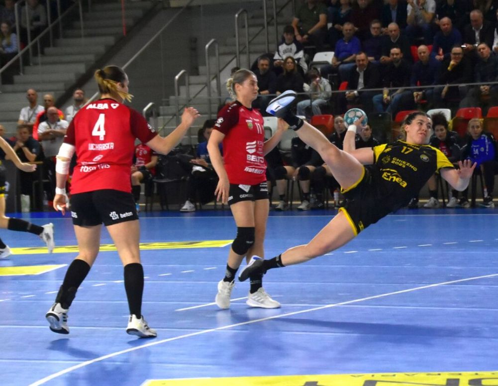 Drugą ładnym rzutem z lewego skrzydła udanie rozpoczęła Żaneta Lipok, a po chwili na 17:15 podwyższyła Monika Łęgowska. Rywalki szybko jednak wyrównały, a w 33 minucie po szybkim kontrataku i kolejnym celnym rzucie Marioli Wiertelak objęły prowadzenie. Gnieźnianki walczyły jednak ambitnie. Najpierw wyrównała Malwina Hartman, a po szybkim kontrataku Oliwii Kuriaty ponownie objęły prowadzenie 19:18. Przez kolejne dziesięć minut rezultat oscylował wokół remisu. Dopiero silny rzut Magdaleny Nurskiej sprawił, że gospodynie uzyskały dwubramkową przewagę 23:21. Na kwadrans przed zakończeniem spotkania był jednak znowu remis 23:23, kiedy Zorica Despodowska „przełamała” dłonie Darii Koniecznej silnie rzucając z siódmego metra. Pięć minut później po kolejnej znakomitej akcji Marioli Wiertelak było 25:26. Gnieźnianki jednak odrobiły stratę, a w 53 minucie prowadziły 28:26. Na niespełna pięć minut przed końcem meczu był remis 28:28.