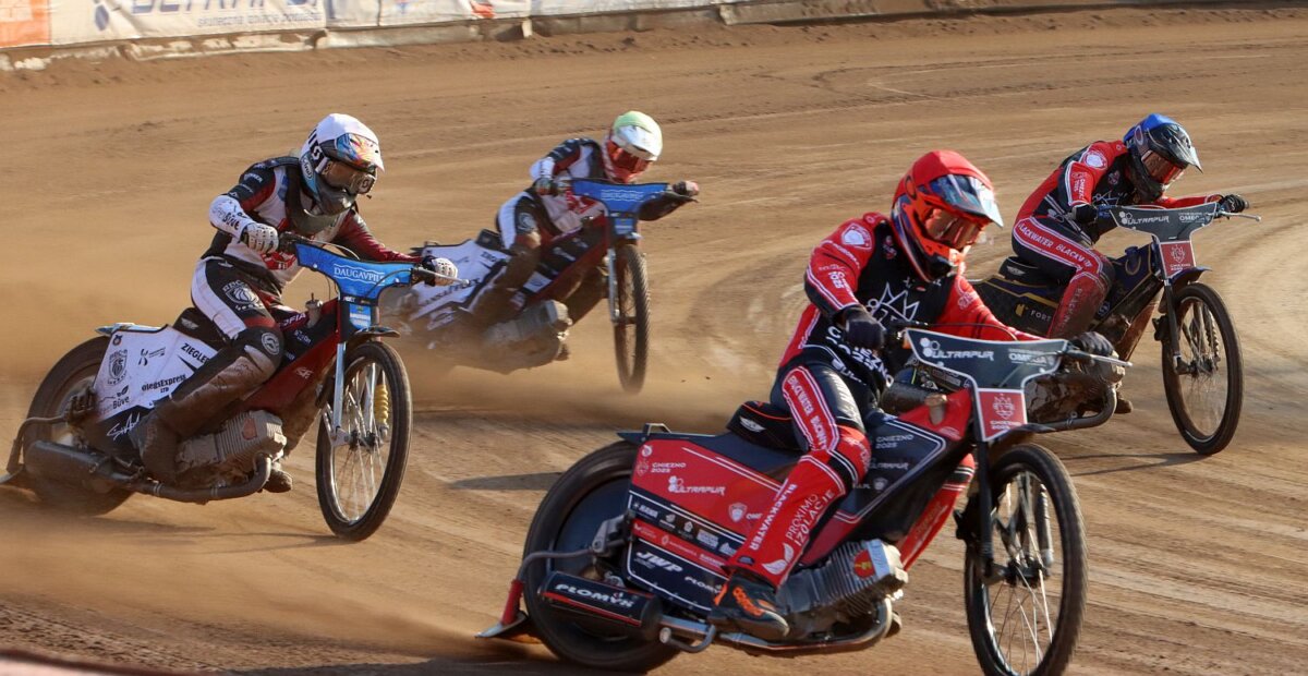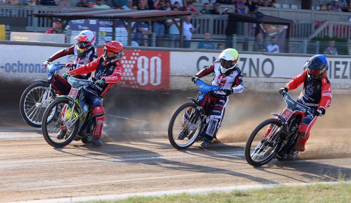 Goście szybko odpowiedzieli jednak podwójnym zwycięstwem w wyścigu VIII. Kevin Fajfer faulował Kjastasa Puodżuksa i mimo że upadek Łotysza miał miejsce na pierwszym wirażu sędzia słusznie wykluczył gnieźnianina, a w powtórce osamotniony Jędrzej Chmura nie dał rady rywalom. Do upadku na pierwszym wirażu doszło również w kolejnej gonitwie. W walce o prowadzenie z Kacprem Gomólskim w luźnej nawierzchni, przy bandzie zakopał się Danniłs Kołodińskis. Sędzia zarządził powtórkę w pełnym składzie. Łotysz, mimo groźnie wyglądającego upadku, wygrał ją, a Kacper Gomólski początkowo trzeci, ostatecznie, w tumanach pyłu, minął linię mety ostatni. Gospodarze zapewnili sobie zwycięstwo jeszcze przed wyścigami nominowanymi, a gonitwa XIII była popisem żużla z najwyższej półki. Najpierw odważny atak na pierwszym wirażu przeprowadził Kevin Fajfer, który z trzeciej pozycji przedarł się na prowadzenie wykorzystując bardzo wąską lukę między dwoma rywalami. Później zaciętą walkę o trzecią lokatę toczyli Casper Henriksson i Kjastas Puodżuks. Pierwszy z wyścigów nominowanych został przerwany przez sędziego z powodu zbyt szybkiego startu Daniły Kołodińskiego. Drugie ostrzeżenie oznaczało wykluczenie Łotysza. Osamotniony Rene Bach odparł ataki obu gnieźnian, ale to gospodarze mogli już cieszyć się z bonusu. W ostatnim wyścigu startowcy podwójną wygraną przypieczętowali zwycięstwo w rundzie zasadniczej już na kolejkę przed zakończeniem zmagań. Łotysze stracili trzecią lokatę, ale wciąż mają szanse na awans do rundy play-off.