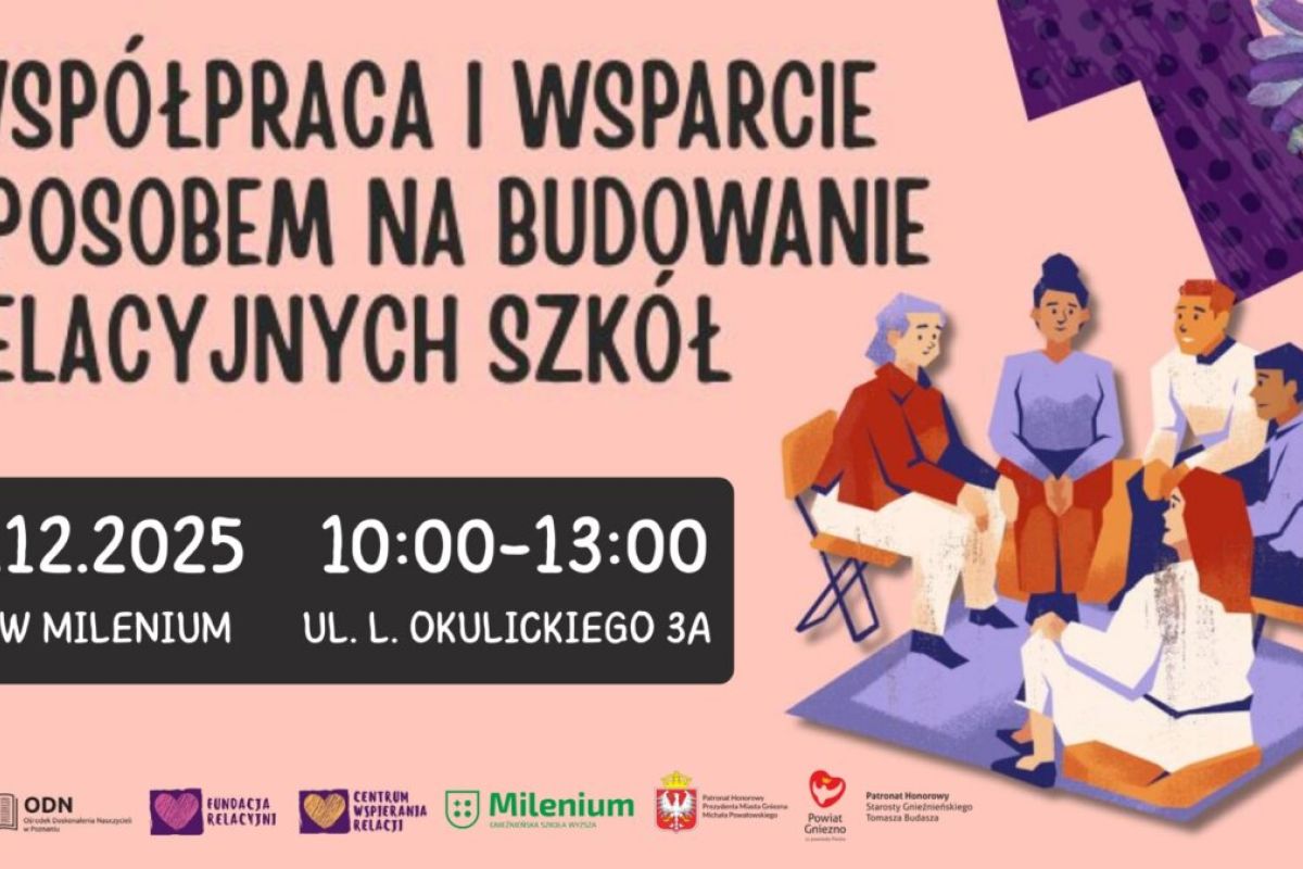 Gnieźnieńska Szkoła Wyższa Milenium, wspólnie z Ośrodkiem Doskonalenia Nauczycieli w Poznaniu, Centrum Wspierania Relacji Fundacja Relacyjni zaprasza kadrę kierowniczą, nauczycieli, pedagogów, psychologów oraz wszystkie osoby zainteresowane tematyką SPE na bezpłatne szkolenie „Współpraca i wsparci…