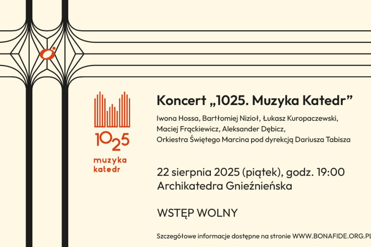 Trwa projekt „1025. Muzyka Katedr”, organizowany przez „Bona Fide. Stowarzyszenie Wielkopolan”. Już 22 sierpnia o godz. 19 w Archikatedrze Gnieźnieńskiej na Wzgórzu Lecha odbędzie się koncert, podczas którego wybrzmi utwór „1025” skomponowany z okazji 1000-lecia koronacji i śmierci Bolesława Chrob…