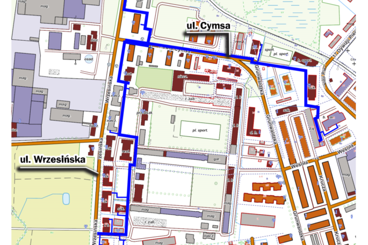 Roboty budowlane będą się odbywać na odcinku, od skrzyżowania ulic Wrzesińskiej i Cymsa, do wjazdu na parking miejski przy budynku na ulicy Cymsa 4…